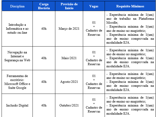 O quadro de vagas, além de trazer informações sobre os requisitos mínimos para os interessados e o nome das disciplinas que farão parte do Curso de Formação, apresenta outras informações importantes sobre a seleção. Confira: