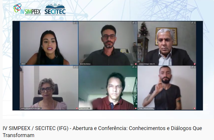 A solenidade de abertura do IV Simpeex/Secitec antecedeu a conferência. A mesa virtual da solenidade contou com as presenças do reitor do IFG, professor Jerônimo Rodrigues da Silva, e dos pró-reitores de Ensino, Oneida Irigon; de Extensão, Daniel Barbosa; e de Pesquisa e Pós-Graduação, Paulo Francinete, além do representante da Comissão Organizadora do evento, José Renato Masson e do secretário de Estado da Secretaria de Desenvolvimento e Inovação, Márcio César Pereira, que representou o governador Ronaldo Caiado. Outras autoridades municipais e estaduais prestigiaram a solenidade de abertura, além de servidores e estudantes das unidades do IFG. O evento teve participação dos intérpretes de Libras (Língua Brasileira de Sinais): Ezequiel Nunes Souza e Thyago Santos. O Simpeex/Secitec segue até o dia 6 de fevereiro, com programação com mais de 200 atividades sendo realizadas pela Reitoria e pelos câmpus do IFG.