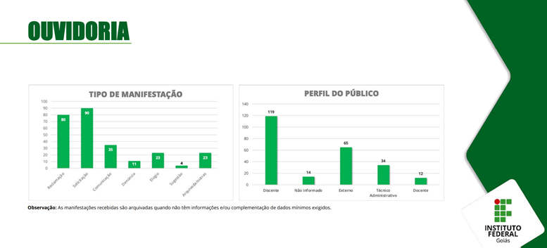 Segundo o relatório de atividades da Ouvidoria, entre 1º de janeiro a 31 de dezembro de 2020, a Ouvidoria recebeu 273 manifestações ao longo do ano. Entre as manifestações, 80 foram reclamações, 90 solicitações, 35 comunicações, 11 denúncias, 23 elogios, 4 sugestões e 23 outras foram arquivadas (veja mais dados nas imagens ao final).