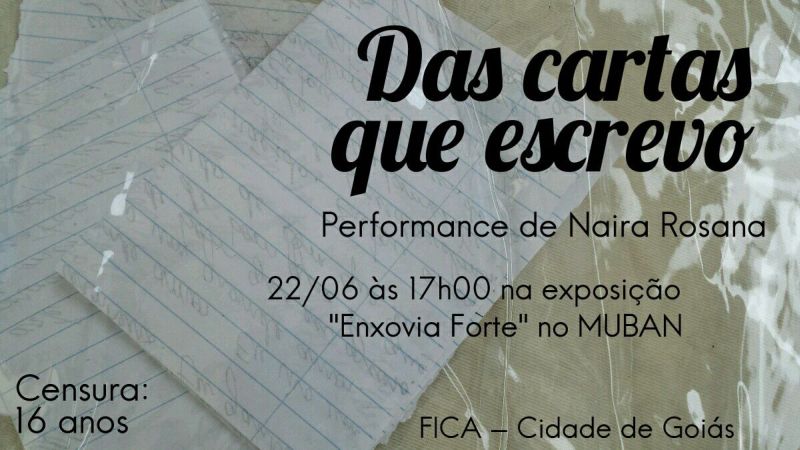 A professora Naira Rosana também realiza duas performances durante o Festival. Hoje, às 19h, no Museu das Bandeiras “Das cartas que escrevo”, ocorre em diálogo com a Exposição “Enxovia Forte” sob a coordenação da professora do Cinema Cris Ventura. Naira explica que a concepção da performance surgiu numa pesquisa sobre a documentação das mulheres que foram encarceradas no Muban no período colonial. “É sobre a questão da mulher, do feminino encarcerado, roubado, mas também da esperança que existia de sair dali, cada carta representa uma mulher e o seu desejo de sair dali”, explica Naira. Essa performance tem classificação indicativa: a partir de 16 anos.