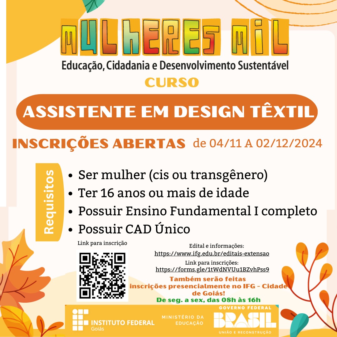 Foi lançada Chamada Pública para o curso de Assistente de Design Têxtil do Programa Mulheres Mil. o Curso de Formação Inicial e Continuada (FIC) é voltado para mulheres (cis ou transgênero) a partir de 16 anos. São 41 vagas e o curso é totalmente gratuito. As inscrições podem ser feitas de 04/11 a 02/12 por formulário eletrônico: https://forms.gle/1tWdNVUu1BZvhPss9 ou presencialmente no IFG das 08h às 16h na Gerência de Pesquisa e Extensão (Gepex) ou Coordenação de Estágio.