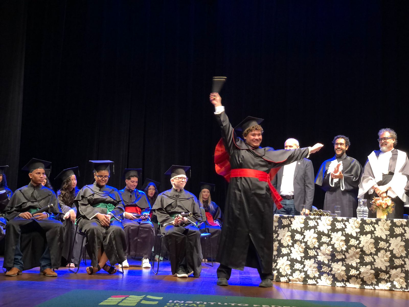Após o discurso de Maya, cada estudantes foi chamado para receber o abraço dos componentes da mesa e o certificado. O Prefeito da cidade, Aderson Liberato Gouveia, participou da cerimônia compondo a mesa junto com o Diretor-geral, Sandro de Lima, da Chefe de Departamento de Áreas Acadêmicas, Meire Lisboa, do Coordenador do curso de Agroecologia, Diogo Souza Pinto, e do Coordenador do curso de Produção de Áudio e Vídeo, João Daniel Ferreira. Em seu discurso, o prefeito ressaltou a importância do IFG, junto às outras Instituições públicas de ensino, na oferta de educação de qualidade no município. "Os cursos ofertados pelo IFG são muito importantes para o nosso município, a agroecologia que pode oferecer alternativas sustentáveis de produção de alimentos aos nossos pequenos agricultores e o audiovisual que pode nos ajudar a contar nossa história, eternizar os momentos memoráveis de nossa cidade que é considerada o berço da cultura goiana, o IFG oferece essa oportunidade de inclusão pela educação e nós estamos aqui para reforçar nossa parceria". Também esteve presente na cerimônia o diretor de comunicação da prefeitura, o cineasta Lázaro Ribeiro.