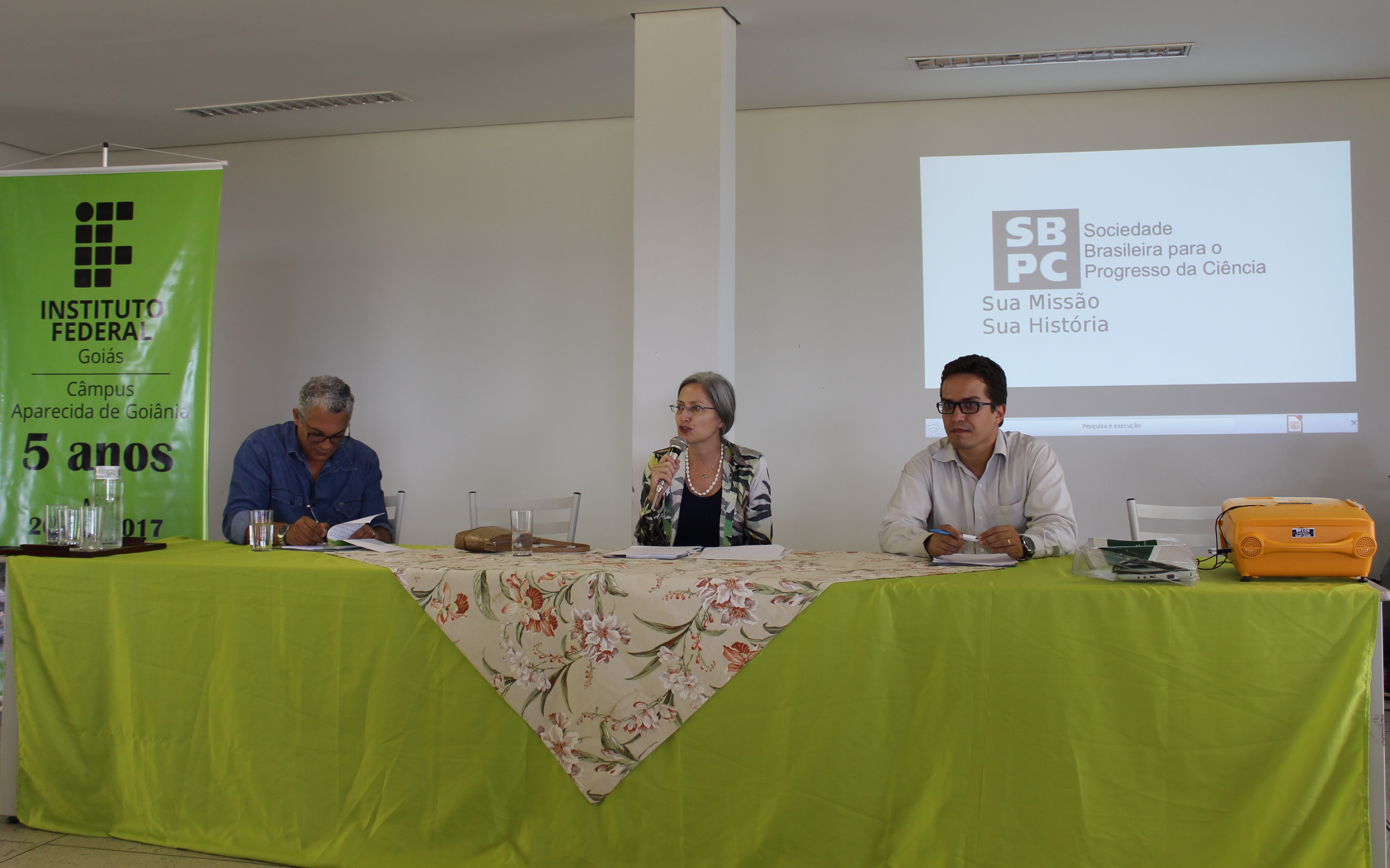Após a cerimônia de abertura, estudantes e professores participaram da mesa-redonda “Pesquisa e Iniciação Científica na Formação dos Jovens de Aparecida de Goiânia”, com a participação de dois convidados: a professora Dra. Ligia Pavan Paptista, da Sociedade Brasileira para o Progresso da Ciência (SBPC - Regional de Brasília/DF), e o professor Dr. Wesley Pacheco Calixto, do Centro de Inovação Tecnológica do IFG. Lígia ressaltou aos adolescentes a responsabilidade que eles têm para o desenvolvimento do País. Ela fez uma apresentação sobre a missão e a história da SBPC, criada em 1948, e incentivou a participação dos estudantes.