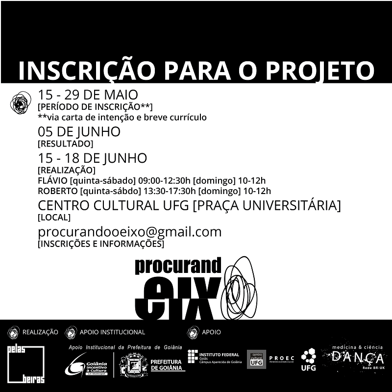 As pessoas interessadas em participar do “Procurando o Eixo”, devem enviar carta de intenção e currículo resumido para o e-mail procurandooeixo@gmail.com. São oferecidas 10 vagas para “Residência Coreográfica em Processos Criativos para o balé” e 20 vagas para o “Workshop Ferramentas para o ensino do balé – estudos anatômicos e didáticos”. A palestra de abertura e a Roda de Conversa são atividades abertas a todas as pessoas interessadas. Acompanhe mais informações sobre o “Procurando o Eixo” na página do projeto no Facebook: https://www.facebook.com/Procurando-o-Eixo-1832833740302119/