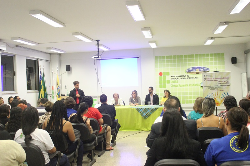 A conferencista comentou que as barreiras discriminatórias na educação, como a surdez, a cegueira e as deficiências motoras, são ainda mais agravadas quando o aluno é desfavorecido economicamente. Ela parabenizou o Instituto Federal de Goiás e o Câmpus Aparecida de Goiânia pela coragem de abraçar o desafio de implantar o curso de Pedagogia Bilíngue. Integraram também a mesa de abertura da 3ª Semana de Pedagogia Bilíngue a diretora-geral do Câmpus Aparecida de Goiânia, professora Ana Lucia Siqueira, a coordenadora do curso de Pedagogia Bilíngue, professora Aleir Ferraz Tenório, e o coordenador de Registros Acadêmicos da Pró-Reitoria de Ensino (Proen) do IFG, Thiago Wedson Hilário, que representou a pró-reitora Adriana dos Reis Ferreira.