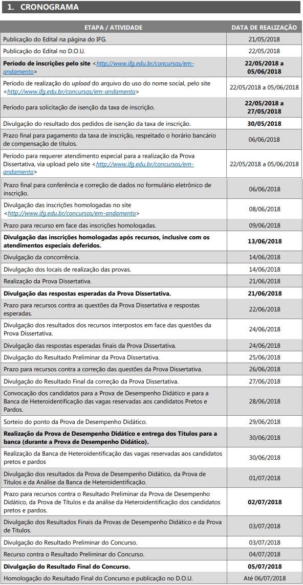 O concurso para docentes será realizado por meio de prova dissertativa, a ser aplicada no dia 21 de junho; de desempenho didático e entrega de títulos, no dia 30 do mesmo mês. Pelo edital, os candidatos realizarão a prova em Goiânia ou em alguma cidade da Região Metropolitana de Goiânia, em locais a serem divulgados no dia 14 de junho. A divulgação do resultado final do concurso será dia 7 de julho, pelo site do IFG, no link de concursos.