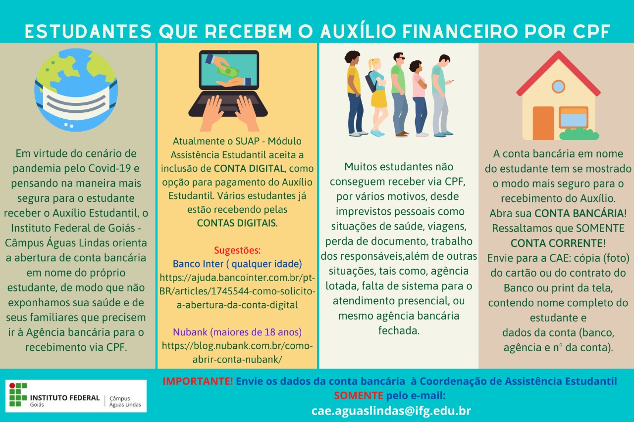 Diante do cenário de pandemia por Covid-19, vários têm sido os enfrentamentos para a efetivação do pagamento dos auxílios financeiros estudantis. O mais recente, é o não funcionamento das agências de Banco do Brasil de Águas Lindas e cidades próximas, como Brazlândia e Ceilândia. São situações que independem da instituição, mas que impactam na vida de nossos alunos. Assim, solicitamos que, quem ainda não possui conta CORRENTE, abra o quanto antes.
