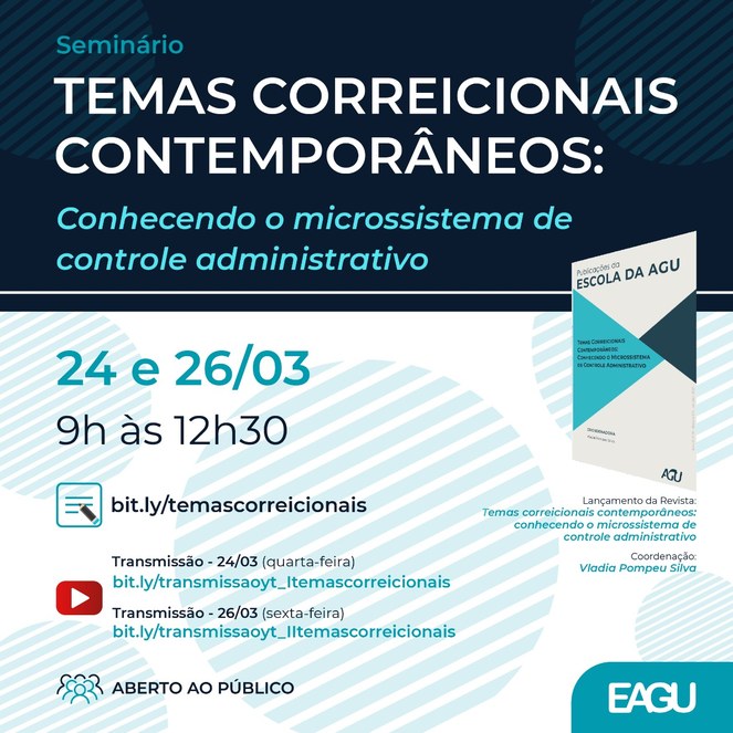 A Escola da Advocacia-Geral da União (AGU) realiza o seminário Temas Correcionais Contemporâneos, nos dias 24 e 26 de março, das 9 às 12h30, on-line. As inscrições devem ser realizadas no link: https://docs.google.com/forms/