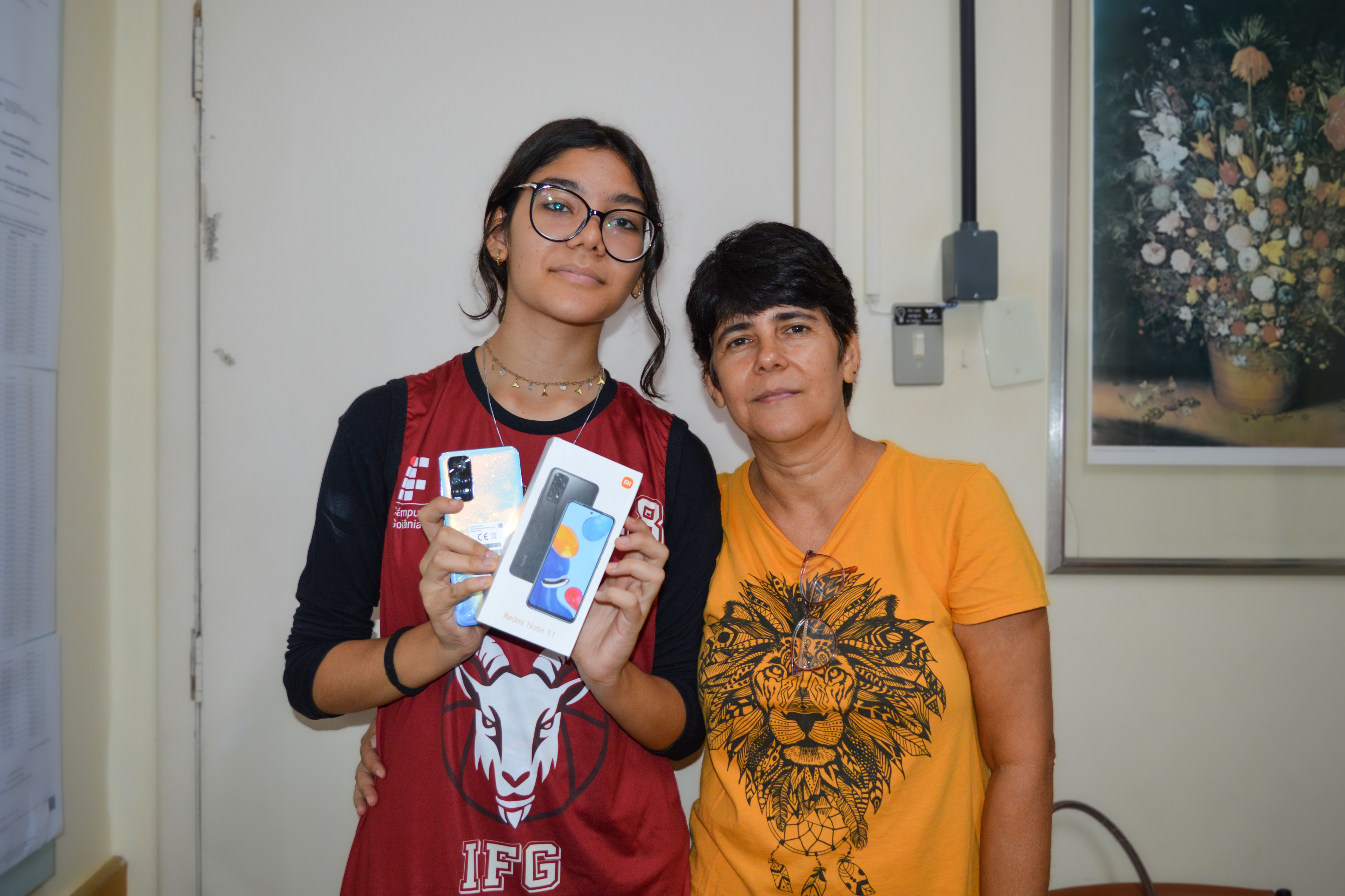 Claudia Lima Silveira é mãe da estudante Sophia Silveira, do curso técnico em Mineração. Ela acompanhou a filha menor de idade para retirar o equipamento. Cláudia possui outros dois filhos estudando no IFG – Davi e Daniel Silveira estão matriculados no curso superior de Engenharia de Controle e Automação – e a doação vai aliviar no orçamento da família. “Eu achei maravilhoso, porque minha despesa com três filhos é bem grande e eu não tinha condições de comprar um celular para ela, e o celular dela é super antigo, não funciona, descarrega. (…) Inclusive, ela é vice-representante de turma. Então toda hora ela recebia recados que ela não podia tá respondendo porque o celular descarregou ou ela não recebeu. Agora ela vai poder ficar tranquila”, avalia.