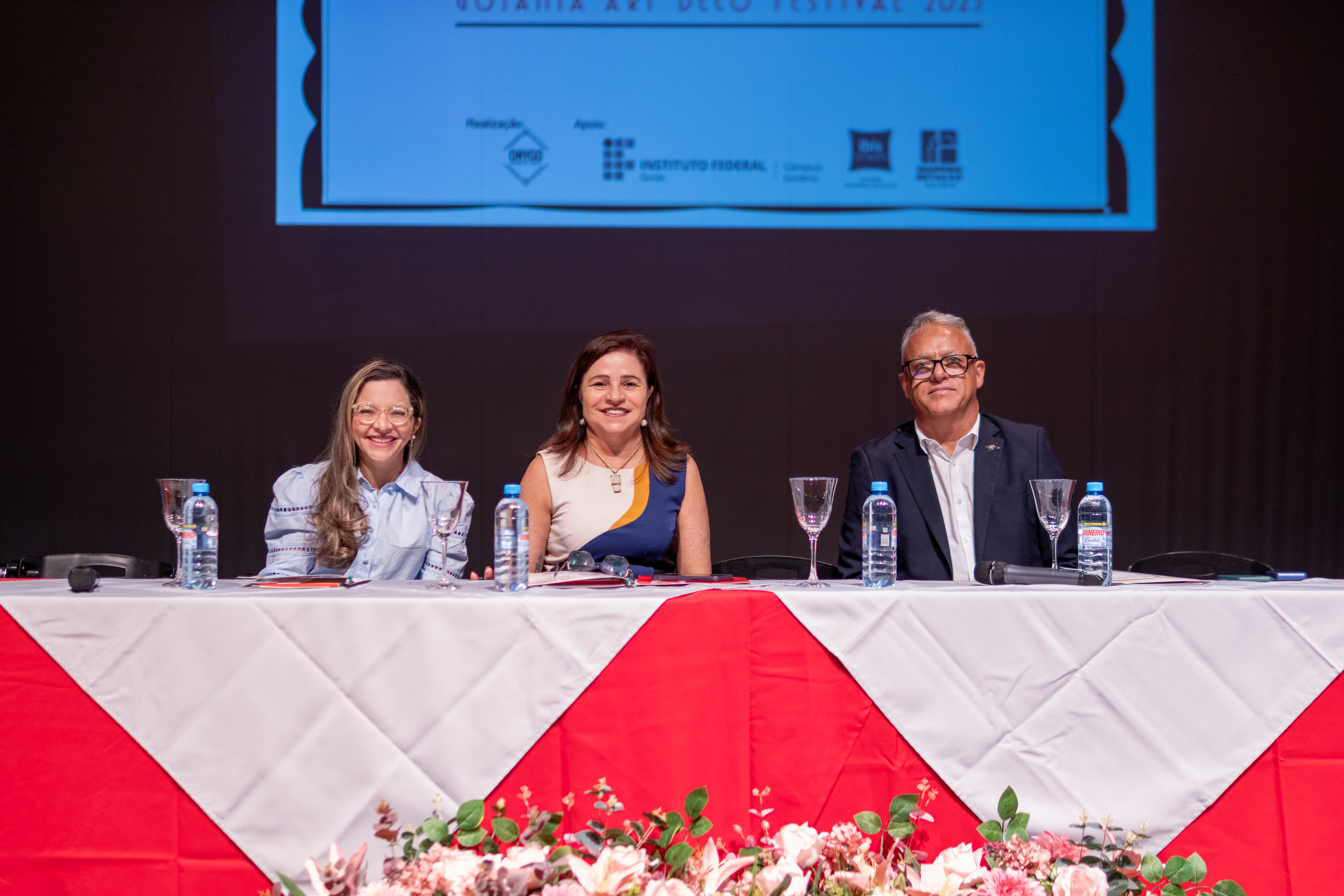 Mesa de abertura oficial da 8ª edição do Goiânia Art Déco Festival 2025, no Teatro do IFG. Na foto, estão: a presidente do Sindicato de Turismo e Hospitalidade no Estado de Goiás (SindTur Goiás), Izabella Luzia Rodrigues (à esquerda); a diretora-geral do Câmpus Goiânia do IFG, professora Adriana dos Reis Ferreira; e o presidente da Associação Brasileira da Indústria de Hotéis – Goiás (ABIH), Charleston Calasans Pimentel.