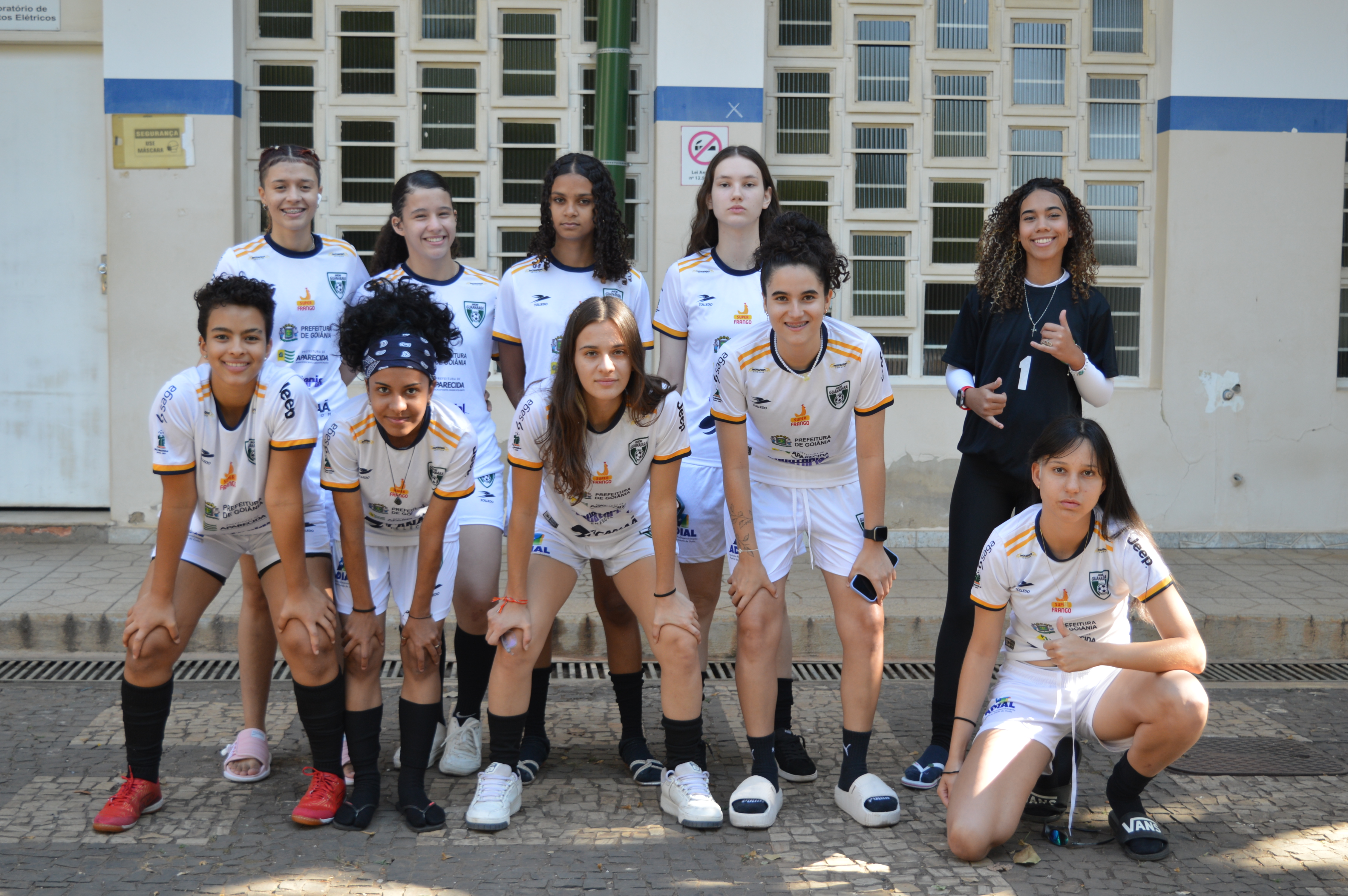 Equipe feminina de futsal. Estudante Sofia Guiotti, do curso técnico integrado em Mineração, está no canto direito da foto, sentada, e posa junto a outras atletas do time.