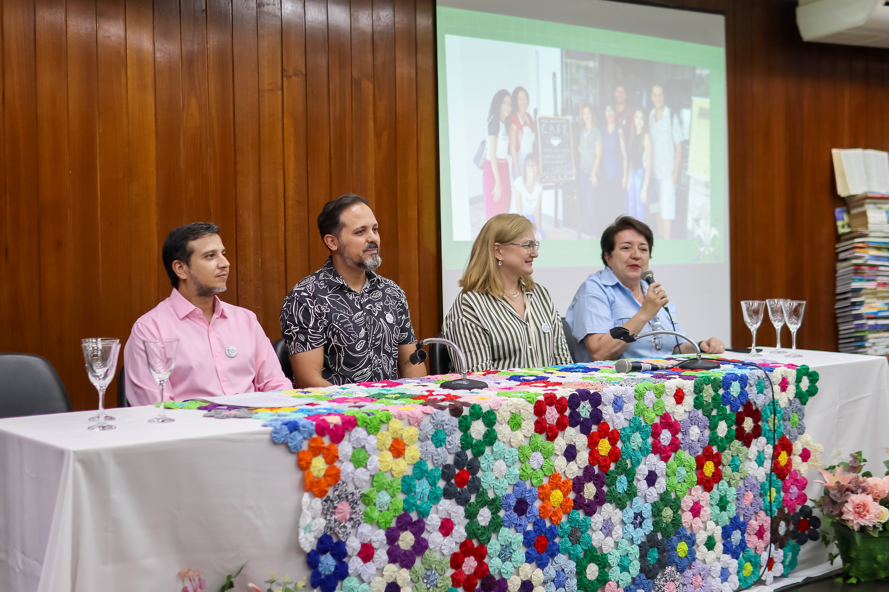 A principal atividade da tarde foi a mesa “Memórias sobre a implantação do curso de Licenciatura em Letras: Língua Portuguesa”, mediada pela professora Suelene Vaz da Silva, com participação das docentes Micheline Madureira Lage e Cleide Pires Machado.