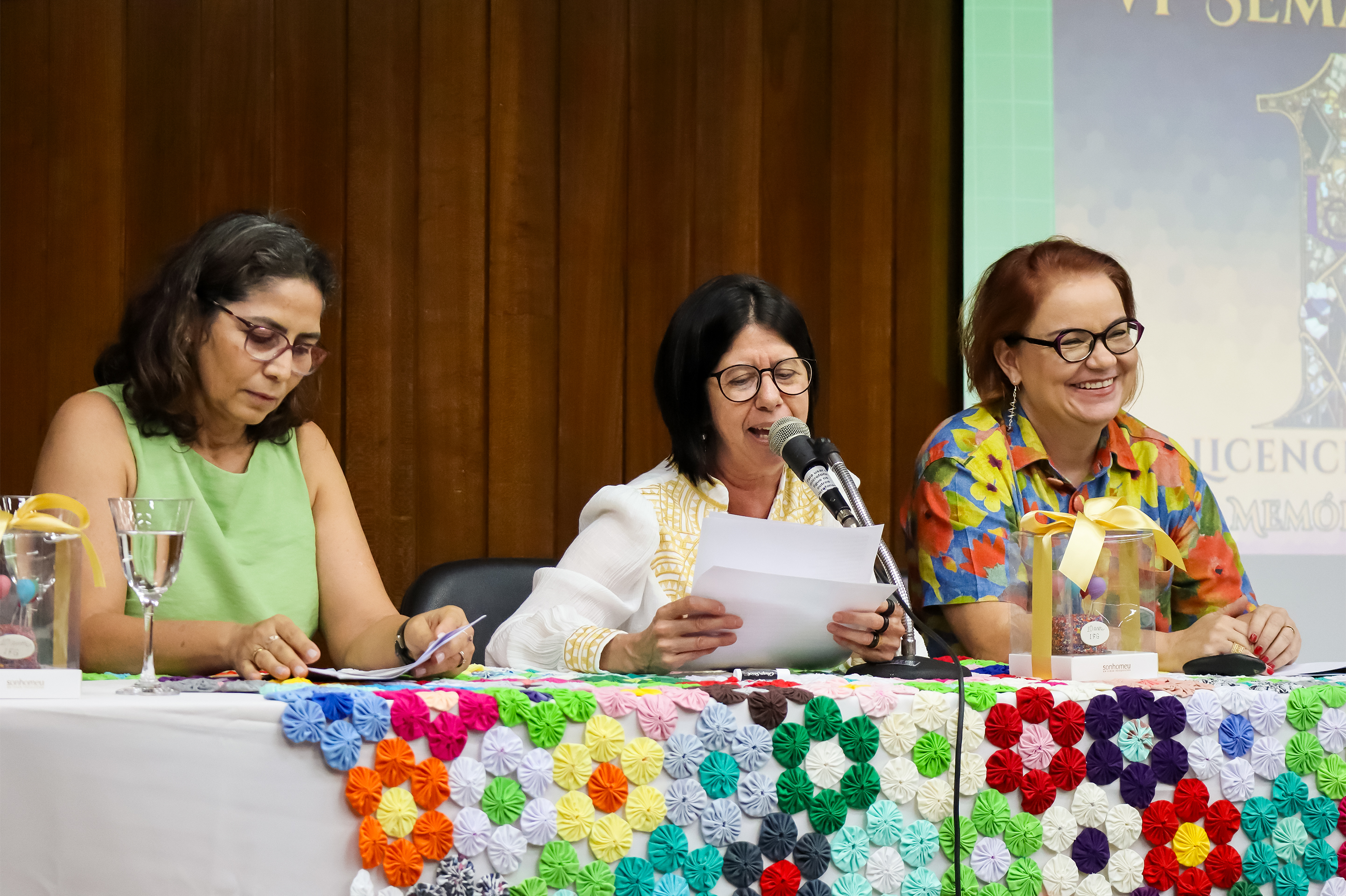 Professoras do curso de Licenciatura em Letras - Português: Cleide Machado, Suelene Vaz e Micheline Lage na abertura do evento.