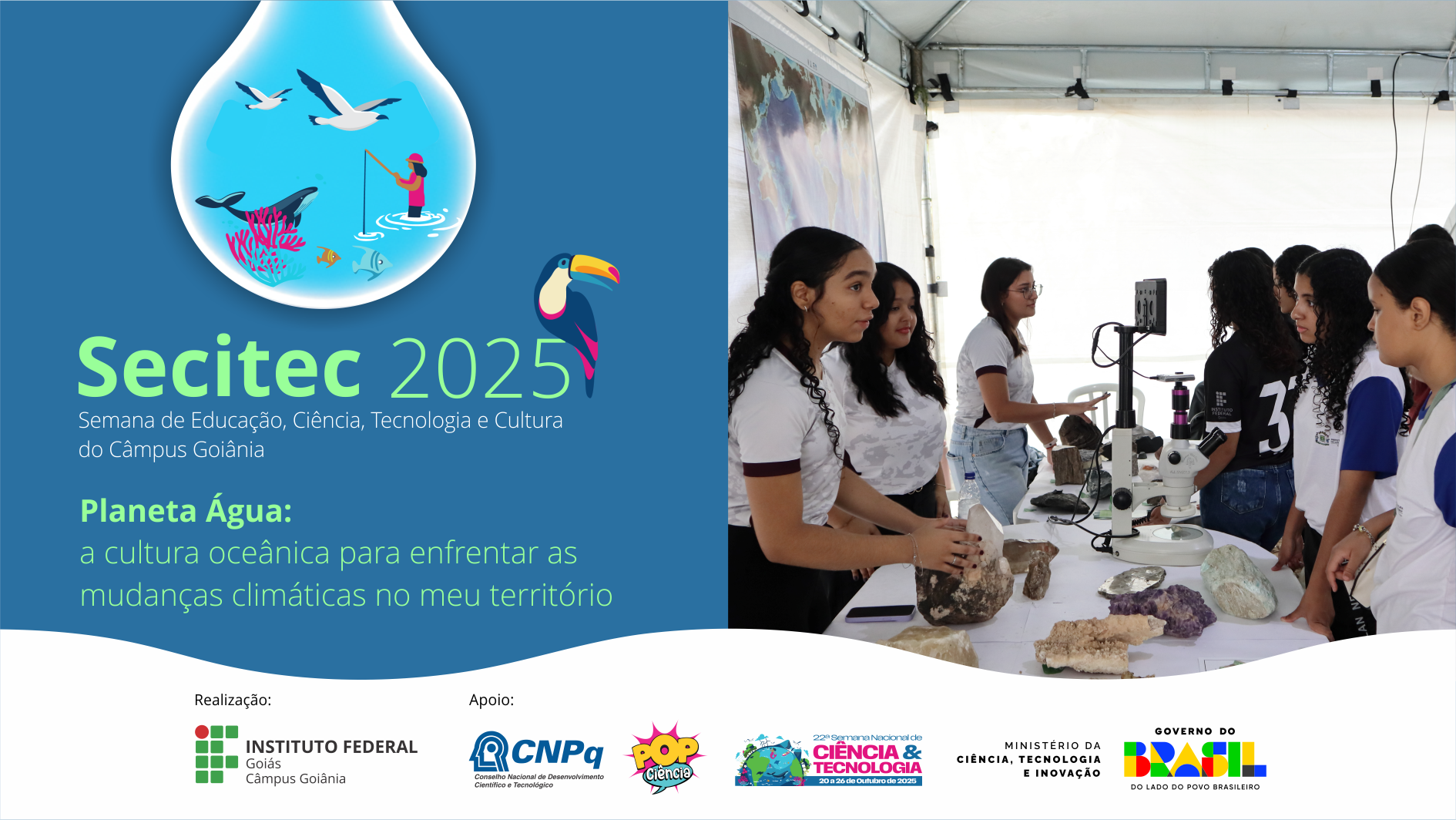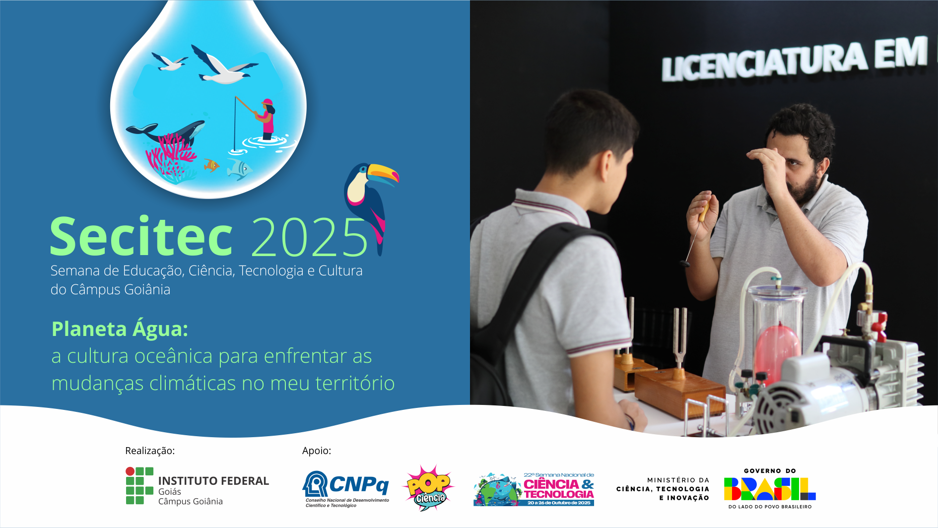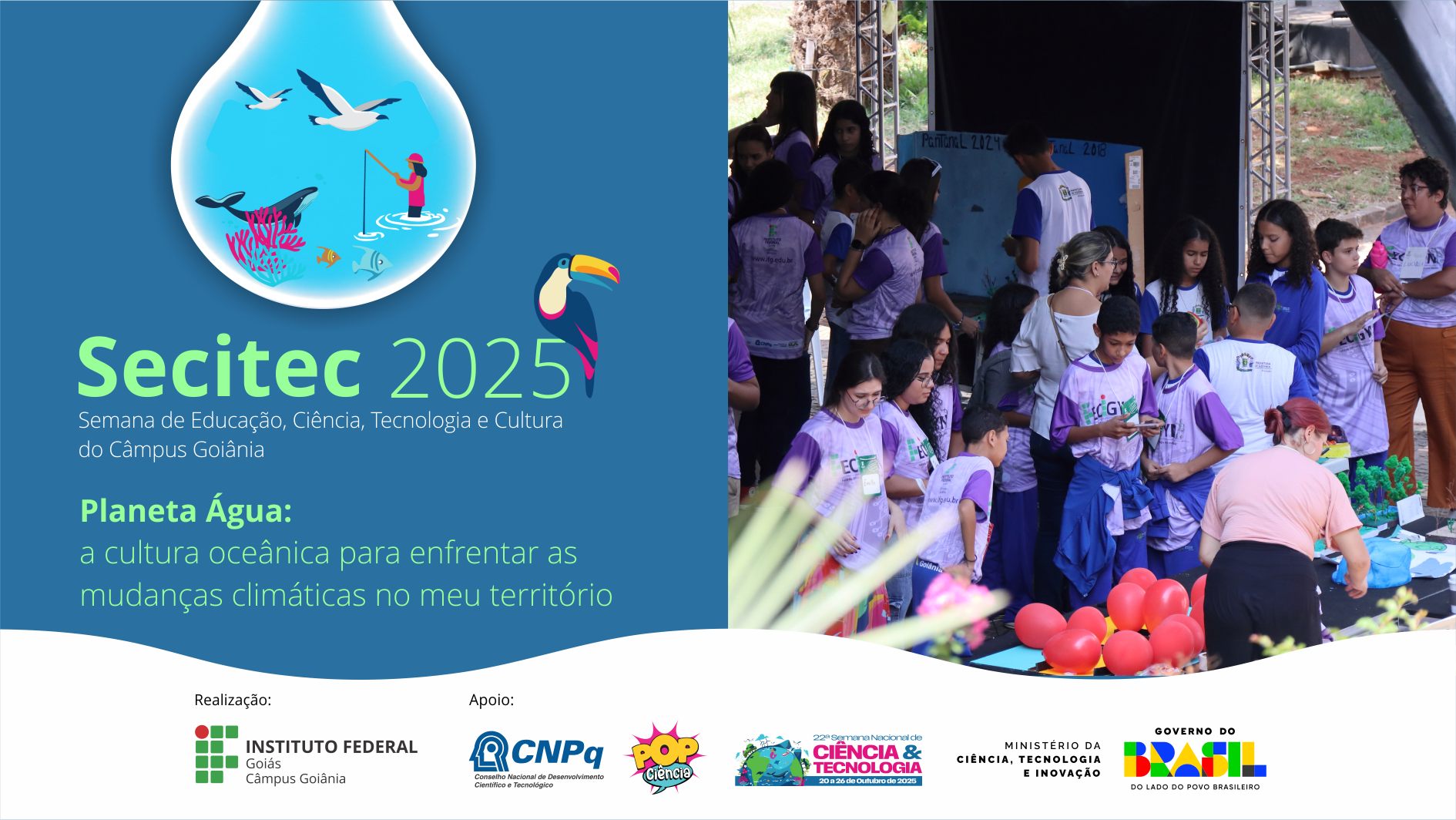 O Câmpus Goiânia do Instituto Federal de Goiás (IFG) realiza a edição 2025 da Semana de Educação, Ciência, Tecnologia e Cultura (Secitec), um dos eventos mais tradicionais da Instituição. Com o tema “Planeta Água: a cultura oceânica para enfrentar as mudanças climáticas no meu território”, a programação está alinhada a 22ª Semana Nacional de Ciência e Tecnologia (SNCT), promovida pelo Ministério da Ciência, Tecnologia e Inovação (MCTI).