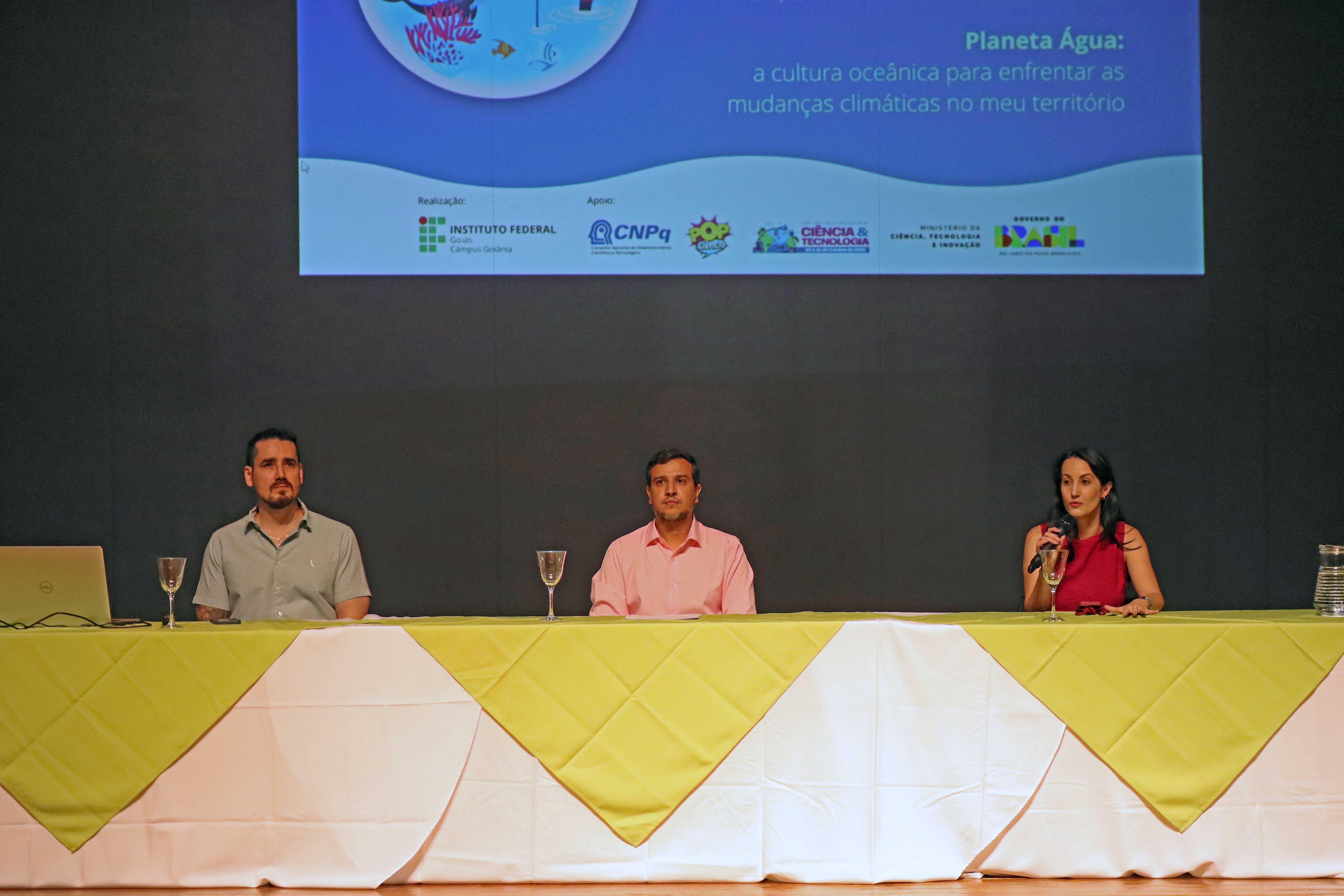 Mesa de abertura da Secitec 2025, com o Gerente de Pesquisa, Extensão e Pós-Graduação do Câmpus Goiânia do IFG, professor Cristiano Costa; o diretor-geral do Câmpus Goiânia do IFG, professor Vinícius Carvalhaes; e a coordenadora-geral da Secitec 2025 do Câmpus Goiânia do IFG, professora Lidiaine Maria dos Santos.