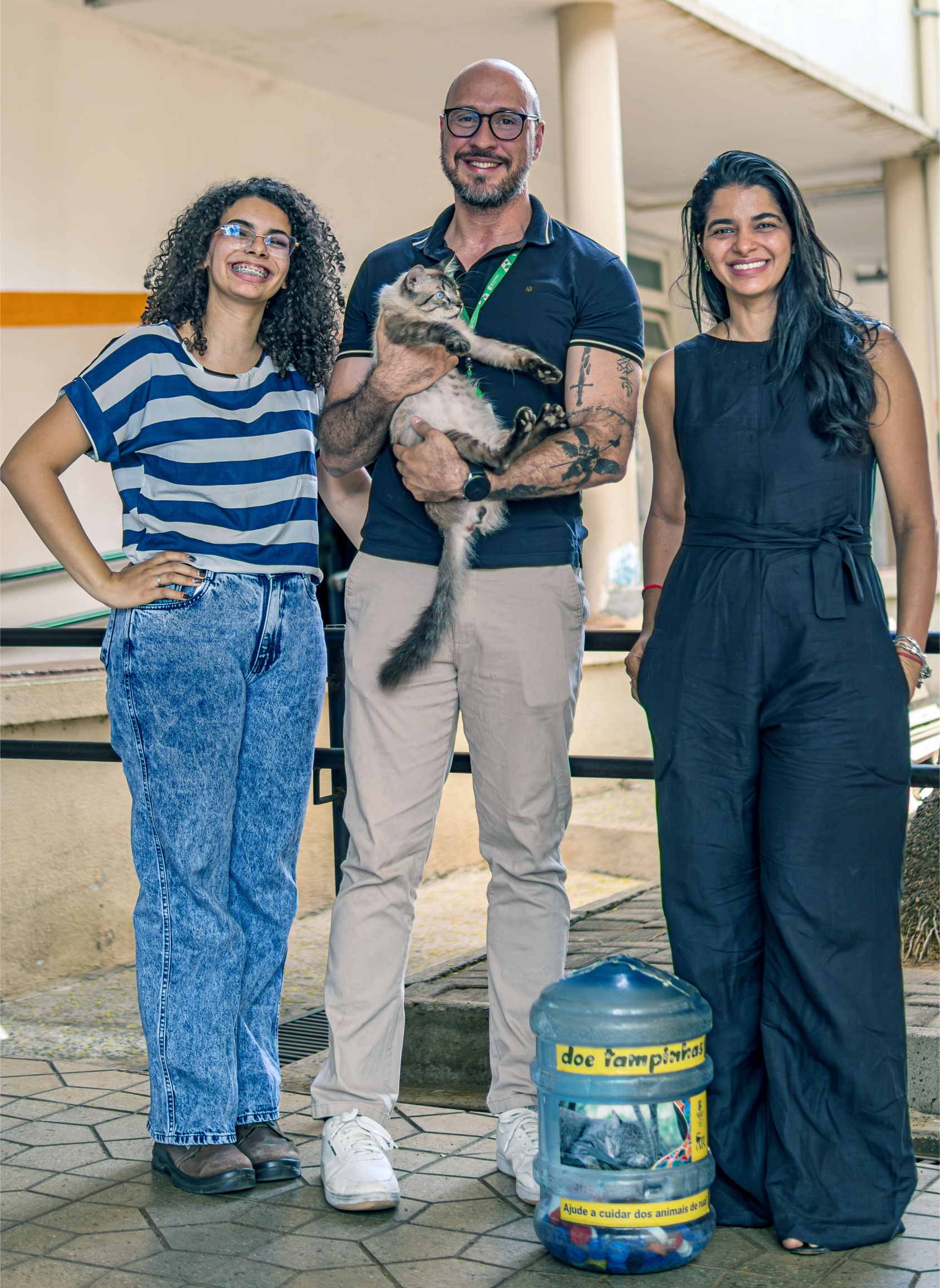 A estudante de Engenharia Ambiental e Sanitária do Câmpus Goiânia, Ana Beatriz Fernandes, o professor Thomas Leal, e a voluntária do Projeto EcoCats, Milena Rocha.