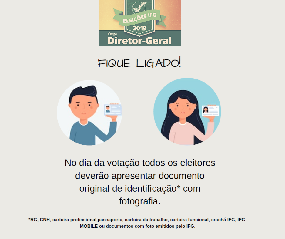 Amanhã, dia 12, é o dia da votação para escolha do novo diretor do IFG Câmpus Goiânia Oeste. Discentes, docentes e técnicos-administrativos terão das 10h às 21h para comparecer a sala 13 do Bloco B para escolher o seu candidato. A lista dos eleitores aptos a votar está disponível no site do IFG e nos murais da Comissão Eleitoral Local no câmpus. Para votar é obrigatório apresentar um documento original de identificação, os documentos permitidos são: RG, CNH, passaporte, carteira de trabalho, carteira funcional, crachá do IFG, IFG Mobile ou documento com foto emitido pelo IFG.