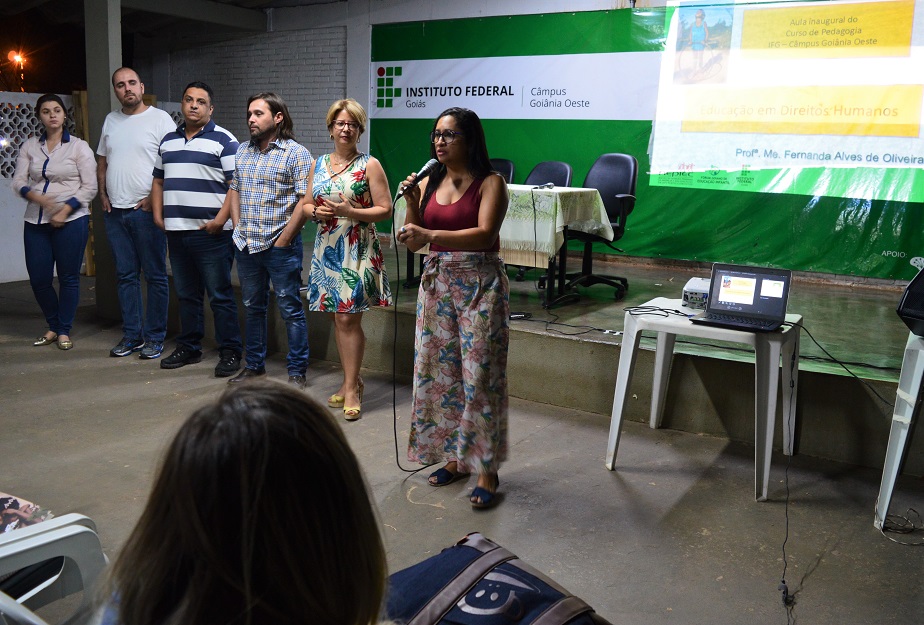 Aconteceu ontem, dia 14, no auditório do IFG Câmpus Goiânia Oeste a aula inaugural do curso superior de Licenciatura em Pedagogia. No primeiro momento da aula, a coordenadora do curso, professora Raclene Ataíde de Faria, deu boas-vindas aos calouros e também aos discentes do curso, que retornaram após o período de recesso acadêmico, e aproveitou a oportunidade para apresentar a gestão administrativa e acadêmica do câmpus. Em seguida, a pedagoga e mestre em Direitos Humanos pela Universidade Federal de Goiás (UFG), Fernanda Alves de Oliveira, dialogou com os alunos e professores presentes sobre a temática Educação e Direitos Humanos.