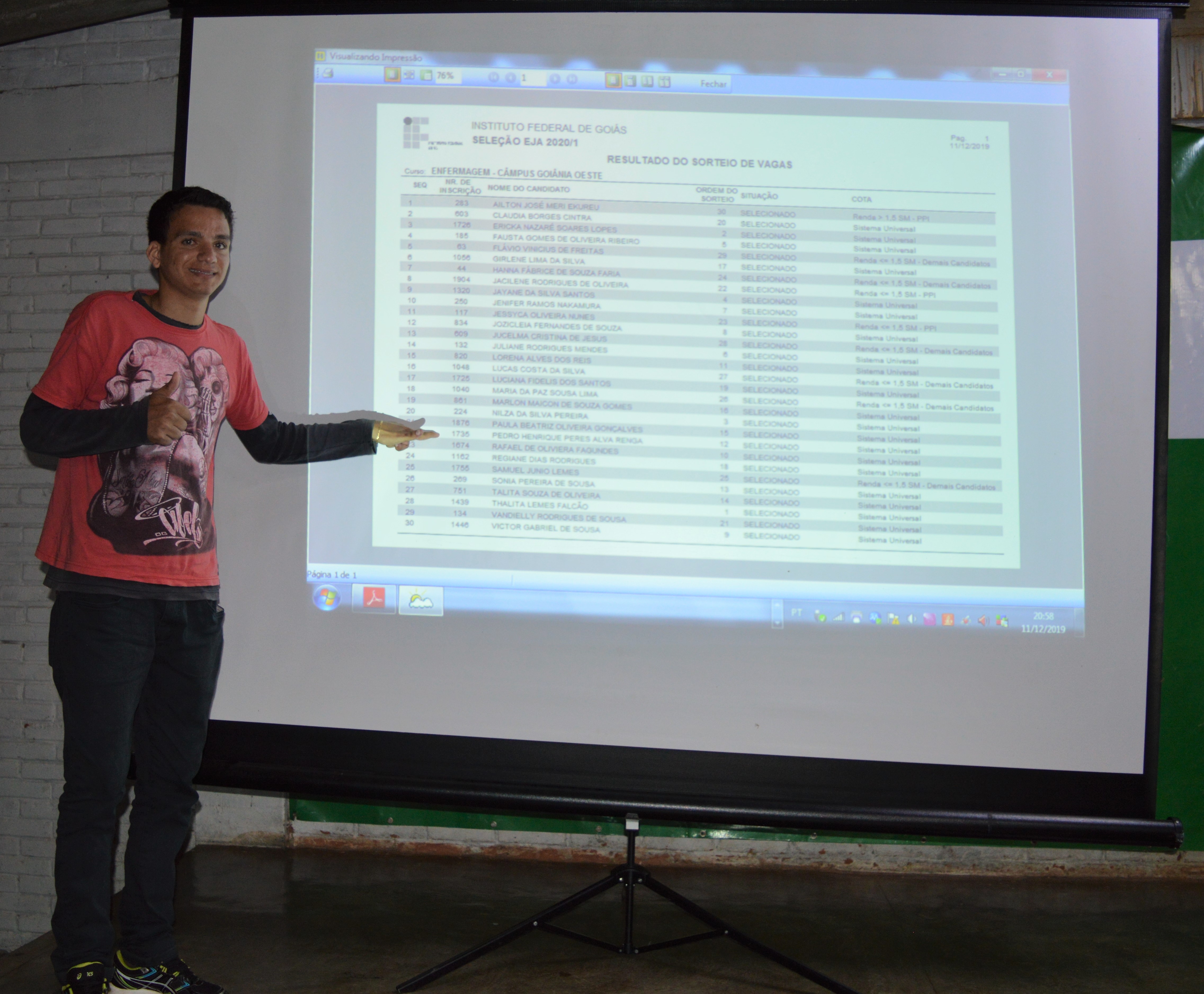Os portões foram fechados ontem, dia 11, às 19h45 e a palestra iniciou às 20h, conforme previsto no edital. A coordenadora do Curso Técnico em Enfermagem, professora Thays Angélica de Pinho Santos, explicou aos presentes o funcionamento do curso e a área de atuação da formação. Após a palestra, foi realizado o sorteio e anunciado o nome dos 30 candidatos selecionados para ingressar no curso Técnico em Enfermagem modalidade EJA no IFG Câmpus Goiânia Oeste. Foram mais de 300 inscritos para o curso Técnico Integrado em Enfermagem na modalidade EJA no IFG Câmpus Goiânia Oeste. De acordo com a coordenadora de Administração Acadêmica e Apoio Ao Ensino e responsável pelo processo seletivo no câmpus, Lenir de Jesus Barcelos Coelho, não houve intercorrências na seleção que ocorreu de forma tranquila e conforme o esperado.