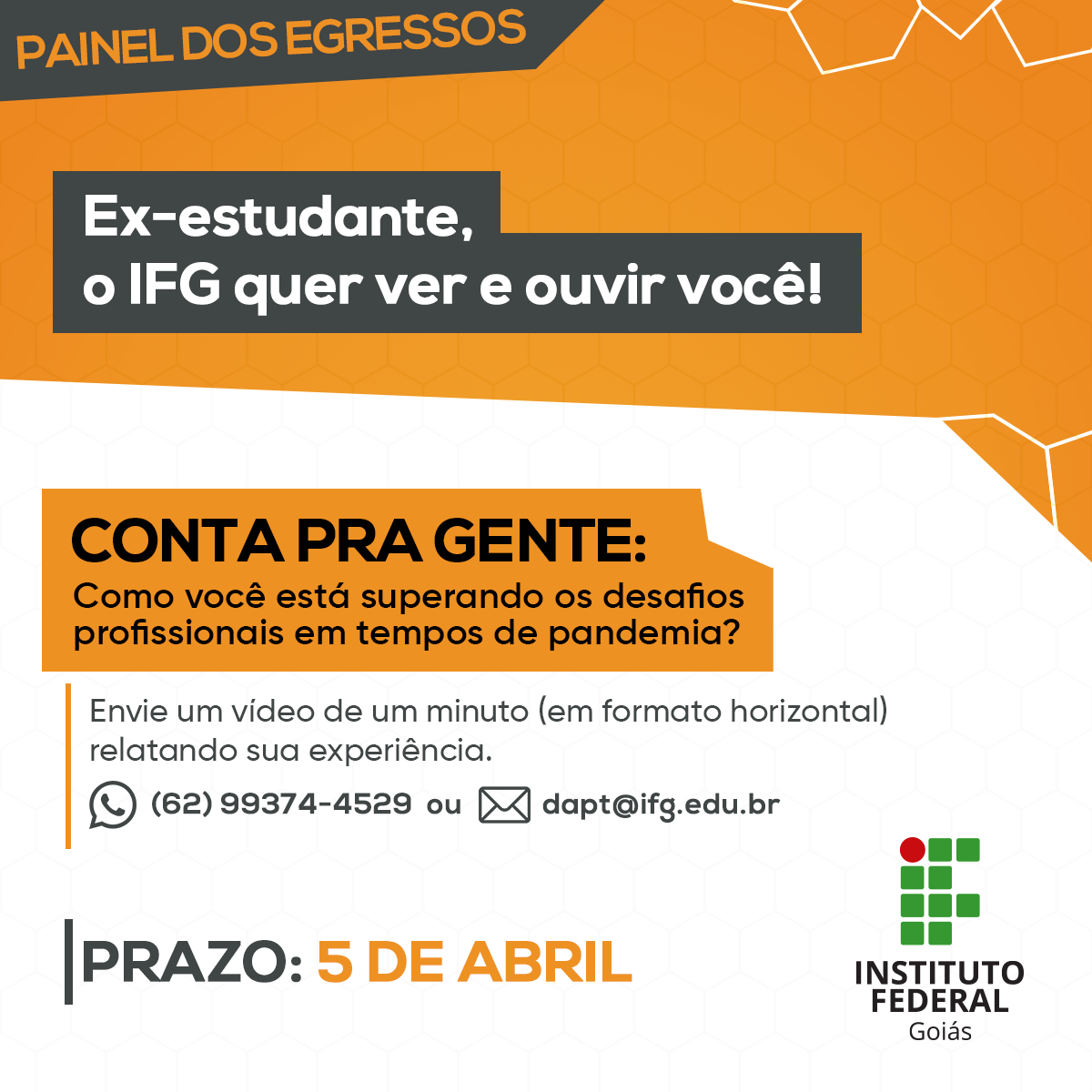 A Pró-Reitoria de Extensão (Proex) do Instituto Federal de Goiás (IFG) realiza até o dia 5 de abril uma campanha institucional voltada aos ex-estudantes da Instituição. Por meio da ação, os ex-alunos do IFG poderão participar enviando vídeos de até um minuto ou texto de até 200 caracteres sobre dois temas.