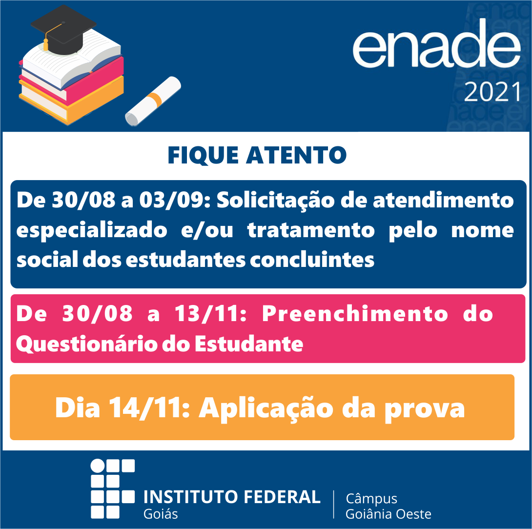 De acordo com o edital nº36, de 12 de julho de 2021, o curso superior de Licenciatura em Pedagogia do Câmpus Goiânia Oeste do IFG foi enquadrado para a avaliação desta edição do exame. Estudantes ingressantes e concluintes devem se escrever no ENADE, porém, a prova é obrigatória apenas para concluintes, por isso, é indispensável que esses alunos participem de uma das reuniões para tirar dúvidas e obter informações em relação a aplicação do exame.