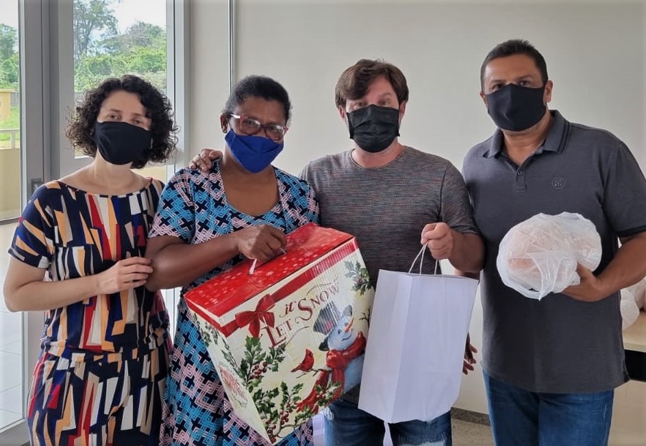 Na última sexta-feira, dia 17, os servidores terceirizados do Câmpus Goiânia Oeste do IFG participaram da confraternização de encerramento do ano com os gestores do câmpus. Durante a confraternização, os servidores terceirizados receberam as 18 cestas natalinas arrecadadas entre os docentes e técnicos-administrativos do câmpus. A entrega das cestas natalinas aos terceirizados é uma tradição que acontece desde 2014, ano de implantação do Câmpus Goiânia Oeste. Normalmente, as cestas são entregues junto com a confraternização de encerramento do ano de todos os servidores do câmpus, porém, devido a pandemia, esse é o segundo ano em que a confraternização precisou ser restrita somente a equipe gestora e os servidores terceirizados.