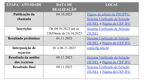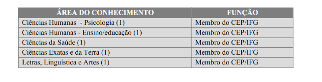 Para participar desta seleção, é preciso ser servidor efetivo do IFG, possuir o título de doutor ou de mestre e estar em exercício pleno de suas atividades. É importante destacar que estão vedadas as participações de servidores que estejam licenciados ou afastados por qualquer motivo. No caso de participação de aposentados, é preciso que o interessado atue como docente permanente de algum programa de pós-graduação da Instituição. Além disso, é preciso ter disponibilidade de tempo para assumir as atribuições pertinentes à função de membro do CEP/IFG.