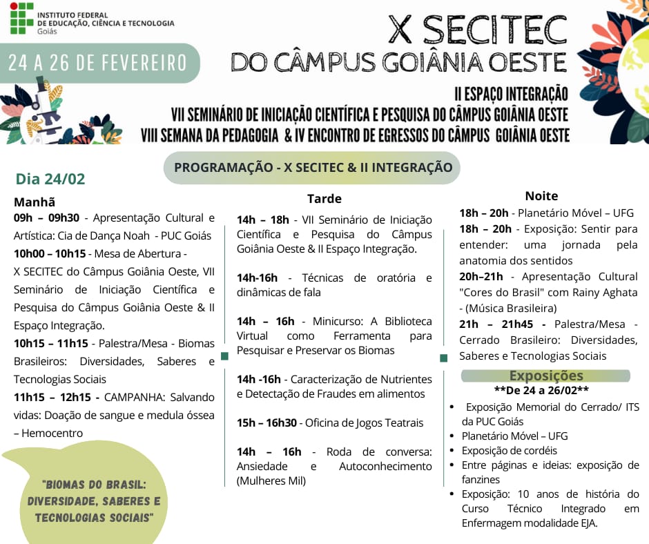 A Semana de Ciência e Tecnologia (SECITEC) é um evento que busca promover uma interface com a sociedade, integrando discentes, servidores e comunidade externa em torno dos programas científicos, tecnológicos e culturais da instituição, ao apresentar a produção desenvolvida pelo Câmpus Goiânia Oeste durante o ano. Seguindo a proposta da 21ª Semana Nacional de Ciência e Tecnologia, a X SECITEC do Câmpus Goiânia Oeste do IFG terá como tema “Biomas do Brasil: diversidades, saberes e tecnologias sociais”.