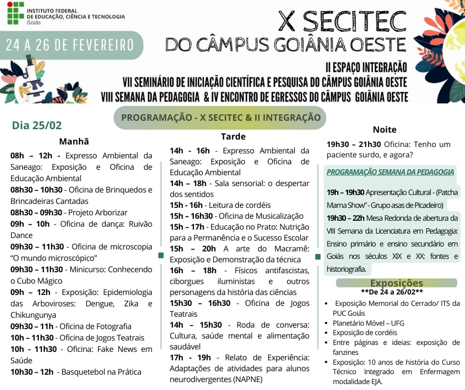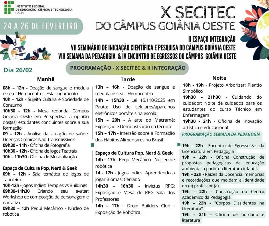 Você está aqui: Página inicial > Últimas Notícias > IFG > Câmpus > Goiânia Oeste > Notícias do Câmpus Goiânia Oeste > Abertas inscrições para atividades da X SECITEC, II Espaço Integração e da VIII Semana da Licenciatura em Pedagogia