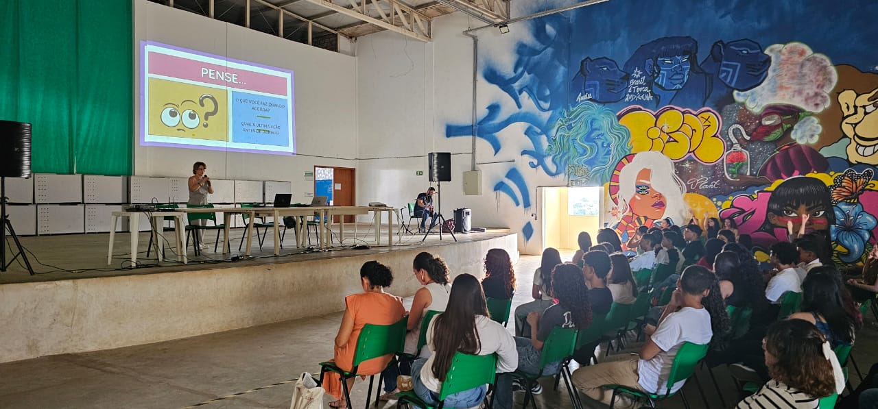 A equipe do Instituto Olhos da Alma Sã também esteve presente no Câmpus Goiânia Oeste para falar sobre o uso exagerado das novas tecnologias na palestra A conexão com a vida e o uso das novas tecnologias. As outras atividades e palestras foram conduzidas pelos professores e técnicos administrativos do Câmpus Goiânia Oeste. A professora Ádria Assunção falou sobre O uso das tecnologias nos espaços escolares. O coordenador acadêmico Victor Racy Abdalla, a coordenadora de Apoio Administrativo ao Departamento de Áreas Acadêmicas, Larisse Faustino da Silva, e os coordenadores de curso apresentaram os cursos e explicaram melhor sobre o dia a dia no câmpus aos alunos ingressantes. A técnica em assuntos educacionais, Letícia Cunha Fernandes e a pedagoga Adelena Leitão Silva Carloto, apresentaram para os estudantes os direitos e deveres que possuem de acordo com com o Regulamento Estudantil do IFG. As servidoras da CAE, Aline Seixas, Clarice Gomes das Neves e Letícia Cunha Fernandes, explicaram para os alunos sobre os auxílios estudantis e apresentaram os editais que estão com as inscrições abertas (Veja aqui os editais). A equipe da biblioteca também participou das atividades da calourada com a palestra Formação para uso da Biblioteca.