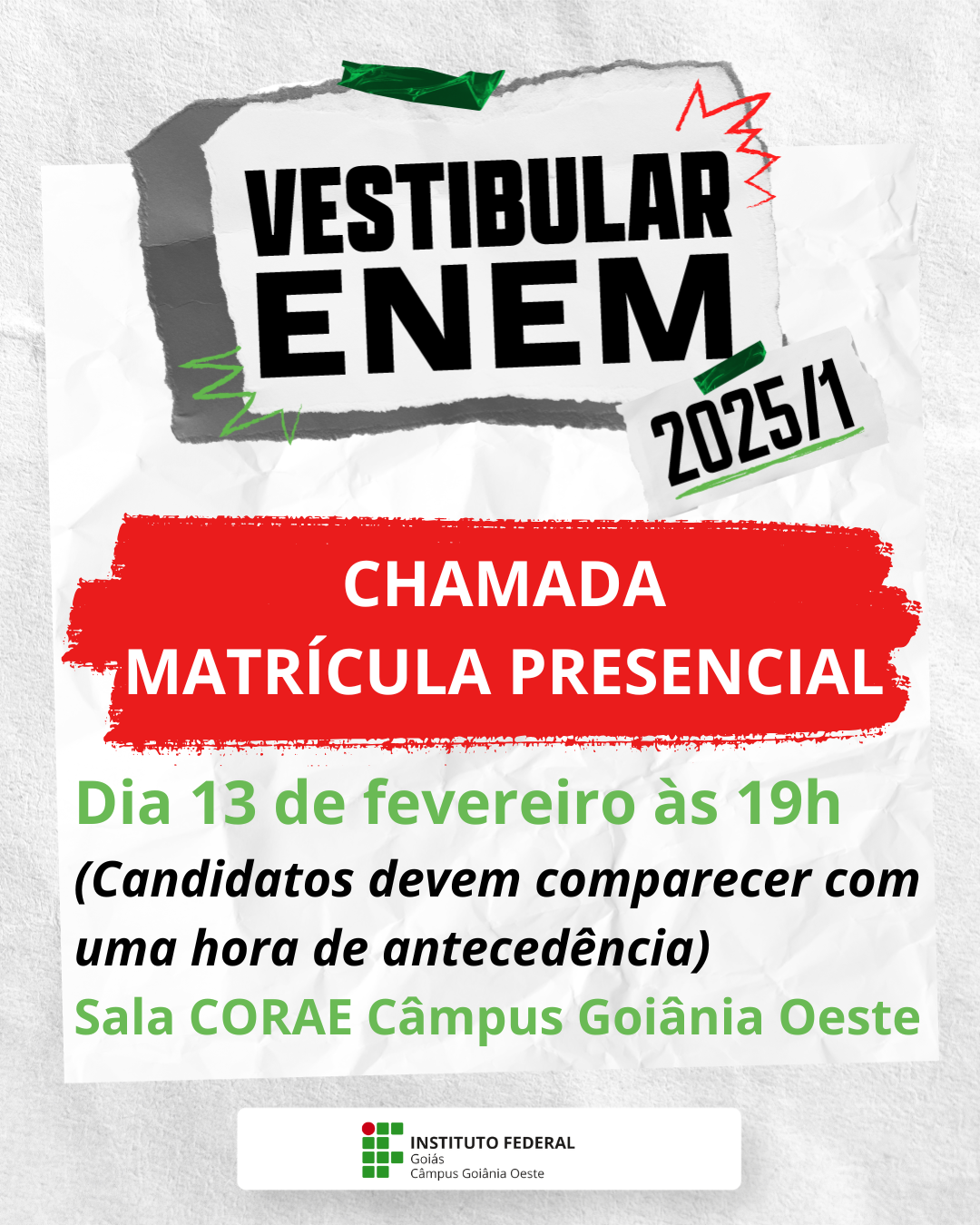 Chamada para Matrícula Presencial do Vestibular Enem 2025/1 acontecerá nesta quinta, dia 13