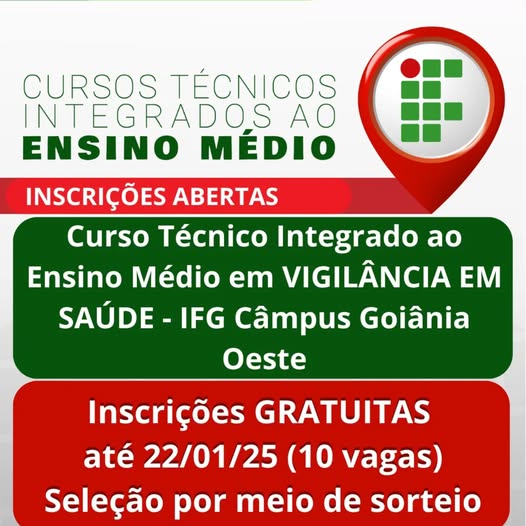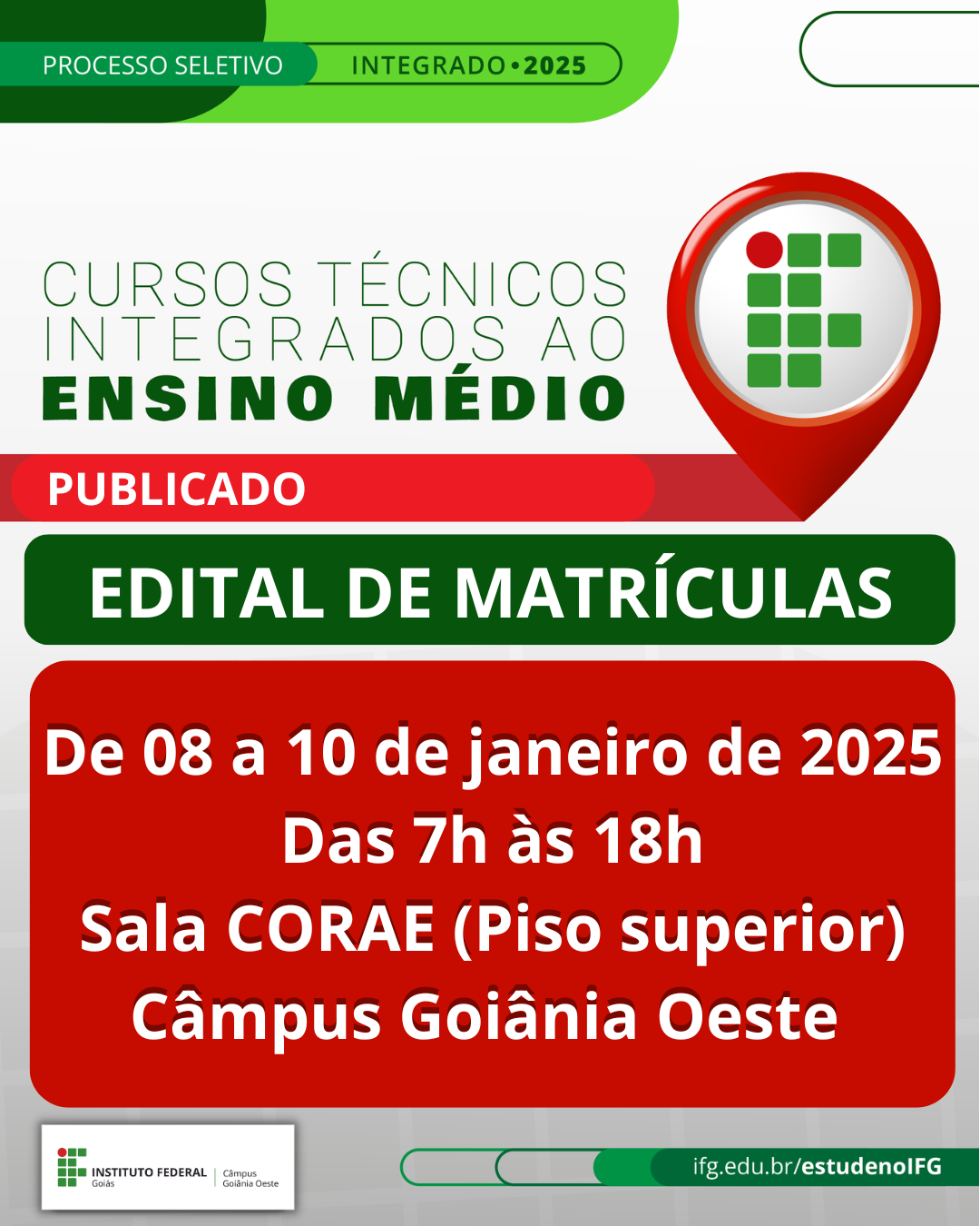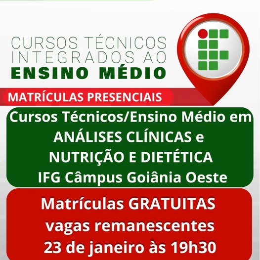 Matrícula deverá ser realizada presencialmente no Câmpus Goiânia Oeste do dia 08 ao dia 10 de janeiro