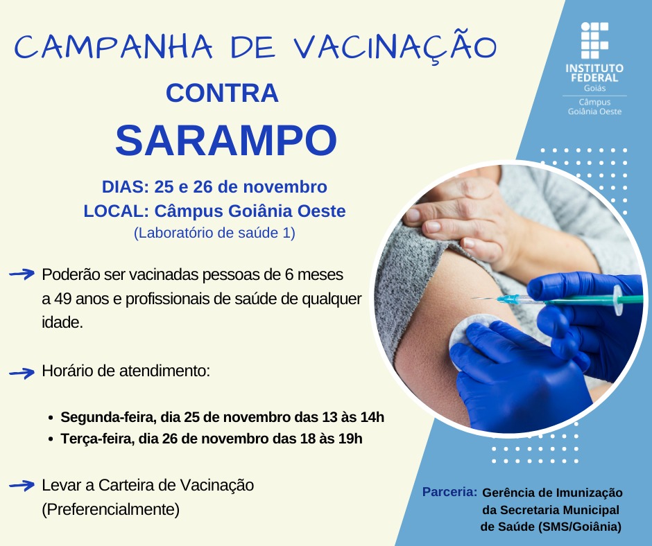 Na próxima segunda e terça-feira, dias 25 e 26, terá Campanha de Vacinação contra o Sarampo no Câmpus Goiânia Oeste