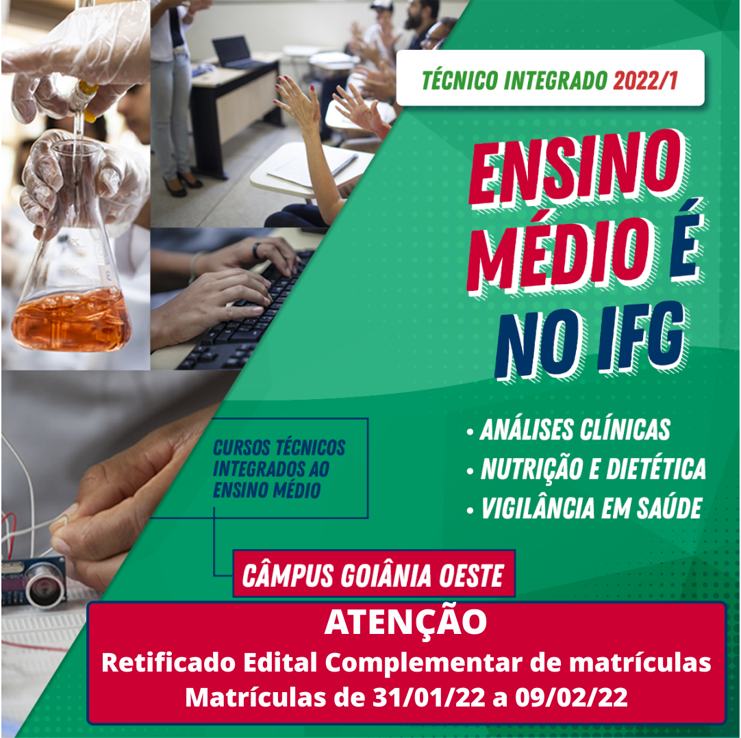 Retificado edital complementar de matrículas da seleção para os cursos técnicos integrados no Câmpus Goiânia Oeste