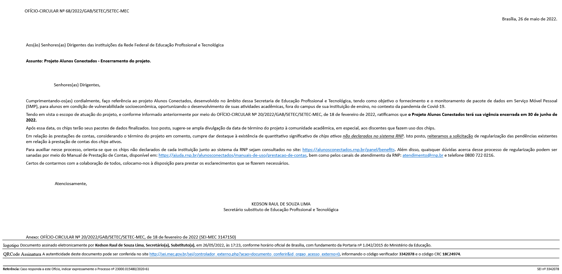 Mais informações podem ser acessadas no Ofício-Circular nº 68/2022/GAB/SETEC/SETEC-MEC, de 26 de maio de 2022, que trata do encerramento do projeto: