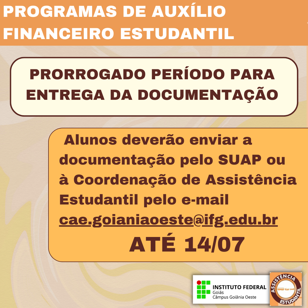 De acordo com a retificação do Cronograma do EDITAL Nº 002/CÂMPUS GOIÂNIA OESTE/IFG/2023 - Auxílios da Política de Assistência Estudantil - os alunos inscritos no edital terão agora até o dia 14 de julho para entregar a documentação comprobatória necessária para a solicitação dos oito diferentes auxílios ofertados no programa.