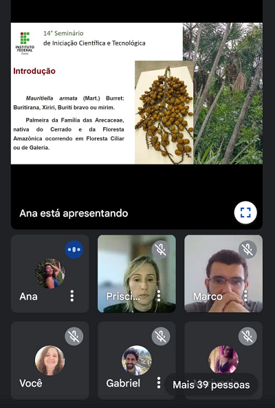 A segunda apresentação foi realizada pela pesquisadora e estudante Ana Lara Silva. O título do trabalho foi Composição lipídica do fruto da palmeira Caranã: uma planta do cerrado goiano. A aluna falou sobre o processo de produção da pesquisa, metodologia e resultados, destacando que durante a pesquisa ela fez a coleta dos frutos, a trituração para estudo e análise da semente, e também da polpa do fruto. “Tudo isso foi um processo manual”, segundo a aluna. Não apenas isso, outra série de análises para além do perfil lipídico também foram feitas para saber questões alimentícias desse fruto.