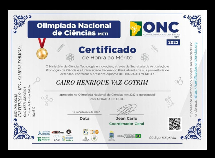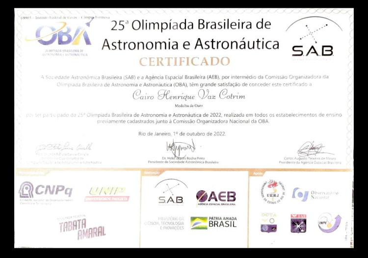 Acumular quatro medalhas em olímpiadas do conhecimento diferentes, no mesmo ano, é possível? Para o estudante da primeira série do curso Técnico Integrado ao Ensino Médio em Saneamento, Cairo Henrique Vaz Cotrim, do Câmpus Formosa do Instituto Federal de Goiás (IFG), sim. Cairo encerrou 2022 com os certificados das competições 25ª Olimpíada Brasileira de Astronomia e Astronáutica (OBA), Olimpíada Nacional de Ciências (ONC) 2022, 2ª Olimpíada Brasileira de Biologia Sintética (OBBS) e 17ª Olimpíada Brasileira de Matemática das Escolas Públicas (OBMEP).