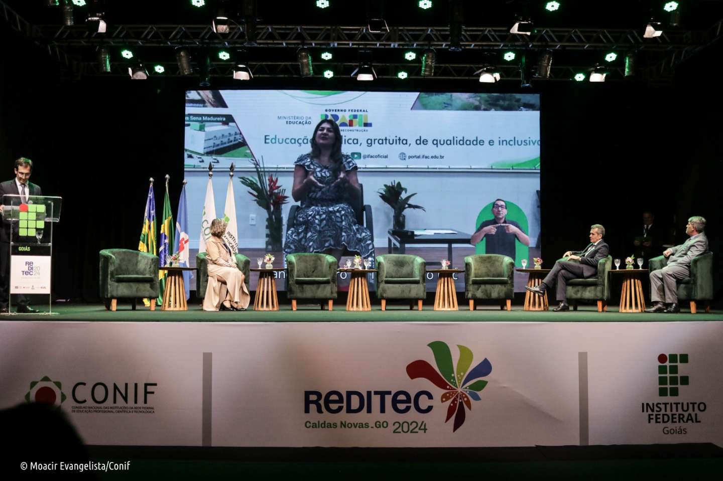 Na mesa diretiva da abertura desta edição da Reditec estiveram presentes Elias Monteiro; Marcelo Bregagnoli; Oneida Cristina Irigon; José Frederico, secretário de Ciência, Tecnologia e Inovação do Estado de Goiás, que representou o governador Ronaldo Caiado; a vice-presidente da Associação Nacional dos Dirigentes das Instituições Federais de Ensino Superior (Andifes), Roselma Luchesi; e o vice-presidente do Conselho Nacional de Dirigentes das Escolas Técnicas Vinculadas às Universidades Federais (Condetuf), Marcelo Freitas da Silva; e o deputado federal Rubens Otoni.