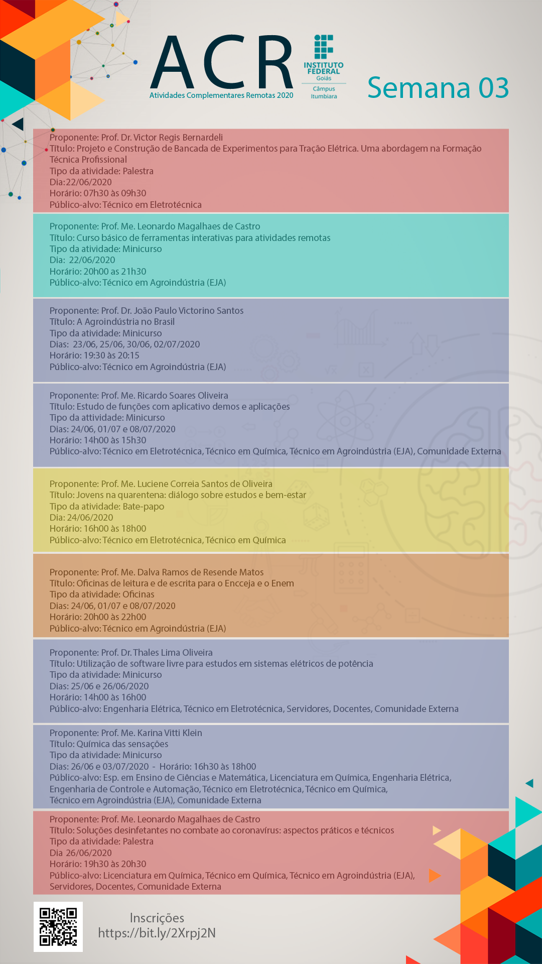 Alunos, servidores e demais pessoas da comunidade externa podem fazer, a partir do meio-dia de hoje, as inscrições para a Semana 3 de Atividades Complementares Remotas. Esta ação é desenvolvida pelo IFG Câmpus Itumbiara de forma totalmente gratuita, que neste período de suspensão do calendário acadêmico, está ofertando atividades para o público do nível médio e ensino superior; e ainda com certificação aos participantes.
