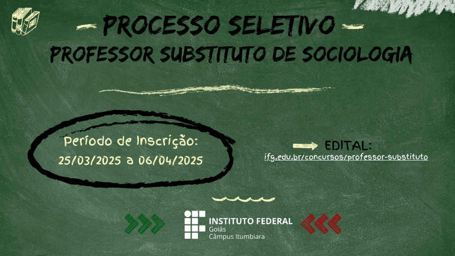 Você está aqui: Página inicial > Últimas Notícias > IFG > Câmpus > Itumbiara > Notícias do Câmpus Itumbiara > Câmpus Itumbiara abre vaga para Professor Substituto de Sociologia