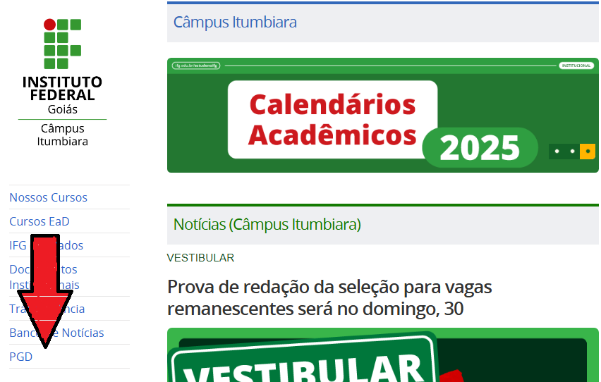 As informações relativas ao PGD estão disponíveis no site do IFG, do lado esquerdo da página, conforme imagem abaixo: