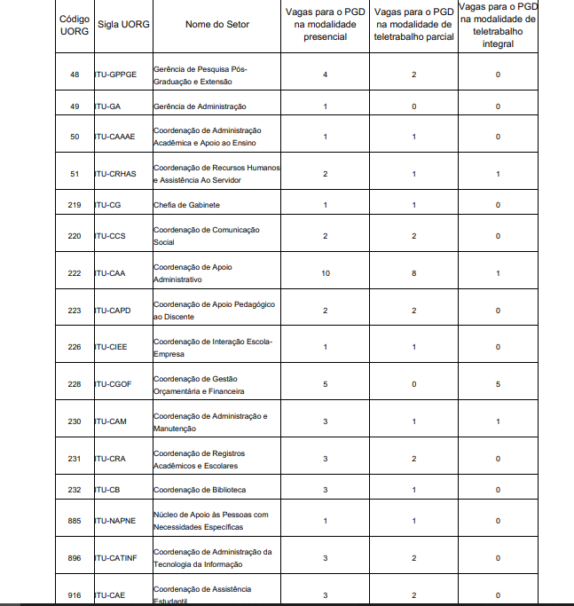 Caberá ao dirigente da unidade a definição do quantitativo máximo de participantes no PGD. As vagas definidas estão disponibilizadas por setor, por unidade (câmpus/reitoria) e com especificação da modalidade de regime (presencial, teletrabalho parcial ou integral) no anexo I dos editais publicados.