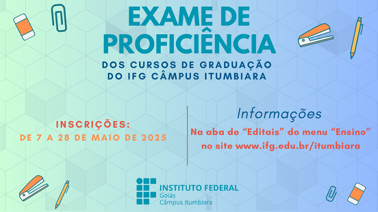 Está publicado o edital nº 0017/2025 referente ao Exame de Proficiência do primeiro semestre de 2025, do IFG Câmpus Itumbiara. Podem participar desta seleção os estudantes regularmente matriculados nos cursos superiores de Engenharia Elétrica, Engenharia de Controle e Automação e Licenciatura em Química. Por meio do Exame, os alunos têm a chance de aproveitar o estudo e/ou conhecimento adquirido em cursos regulares e trabalhos, e assim ficar dispensado de determinada disciplina podendo cursar outras subsequentes.