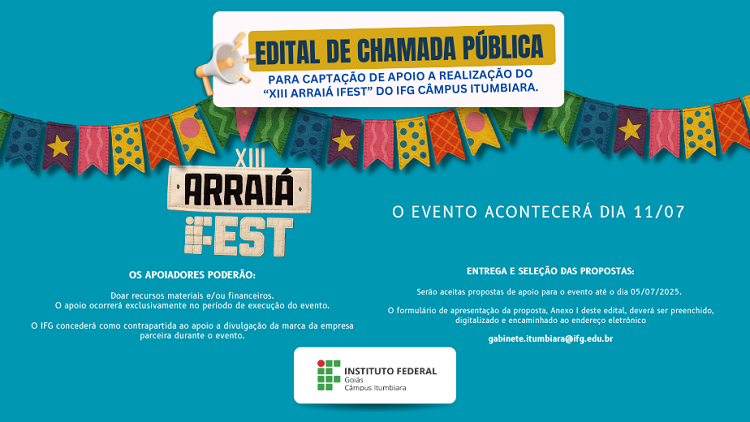 Você está aqui: Página inicial > Últimas Notícias > IFG > Câmpus > Itumbiara > Notícias do Câmpus Itumbiara > Câmpus Itumbiara lança chamada pública para apoio ao XIII Arraiá IFest