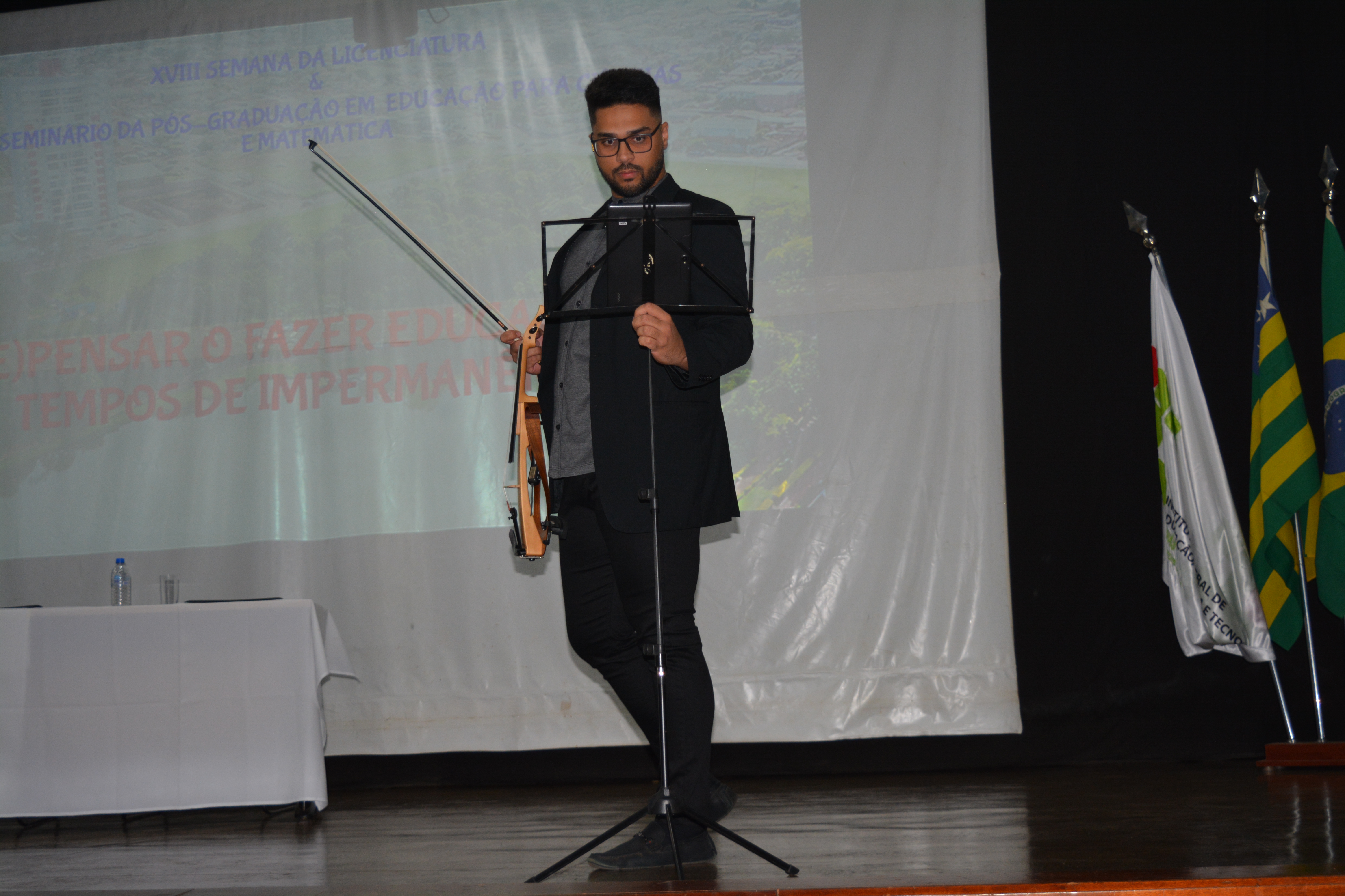 O músico Lucas Dourado abriu a Semana de Licenciatura com uma performance no violino elétrico e mobilizou o público com peças como Anunciação e Bela Ciao. Na apresentação, Lucas falou sobre sua trajetória que partiu da música erudita até alcançar a música popular. Ele destacou que além de tocar violino, faz trabalhos como DJ de música eletrônica.