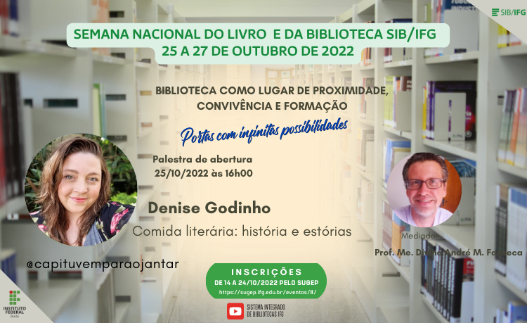 Também no dia 25 de outubro ocorrerá a palestra de abertura no Canal do SIB/IFG no Youtube, intitulada Comida Literária: história e estórias com Denise Godinho e mediação do professor Divino André Martins Fonseca. Denise apontará como a comida em uma obra literária nos permite vislumbrar o contexto político social de um tempo. Ela abordará autorias como as de Cora Coralina, Mário de Andrade, Oswald de Andrade, Machado de Assis, Clarice Lispector e Eça de Queiroz. Denise Godinho é jornalista, escritora, produtora de conteúdo digital @capituvemparaojantar e roteirista do programa "Em Alta" da CNN Brasil.