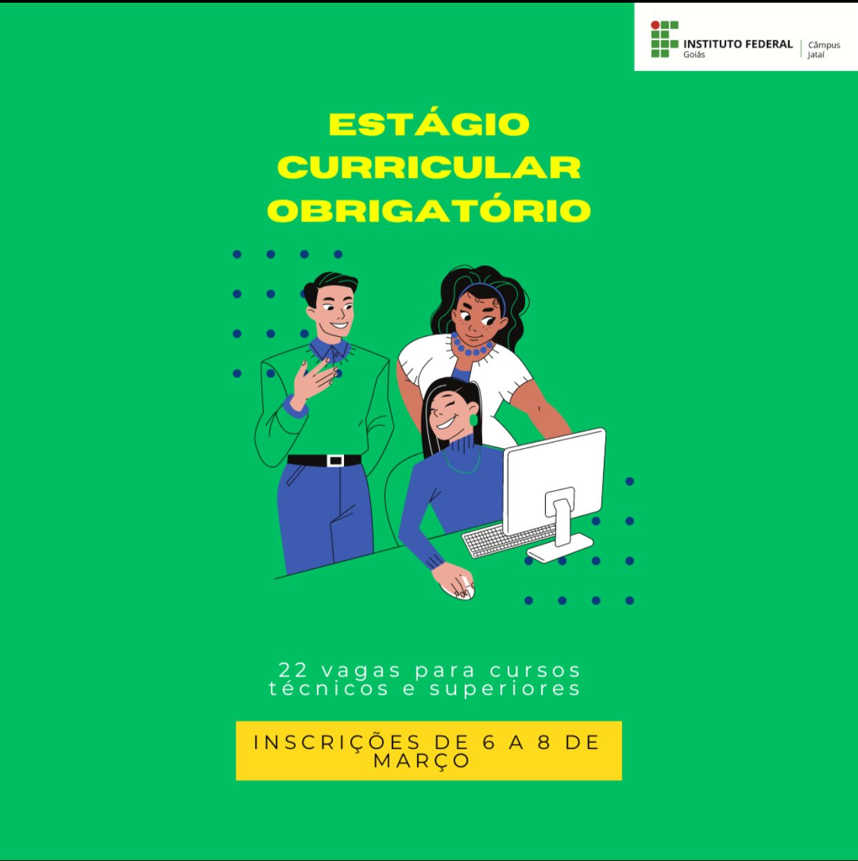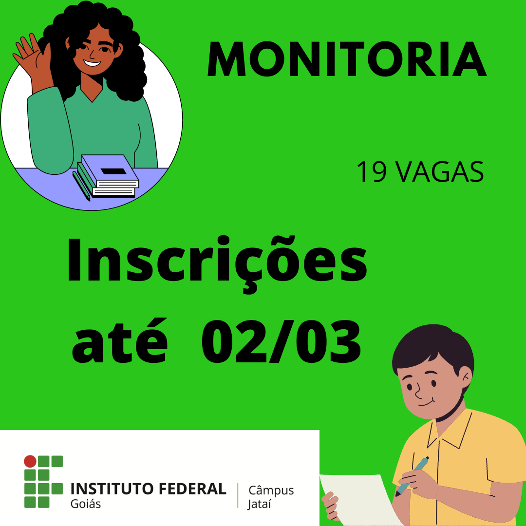 As inscrições para o estágio curricular obrigatório não remunerado oferecido pelo Câmpus Jataí serão realizadas entre os dias 6 e 8 de março. No total foram disponibilizadas 22 vagas para os cursos técnicos e superiores do câmpus. Estudantes regularmente matriculados no câmpus podem concorrer às vagas e atuarão nos setores acadêmicos e administrativos, sob a supervisão de...