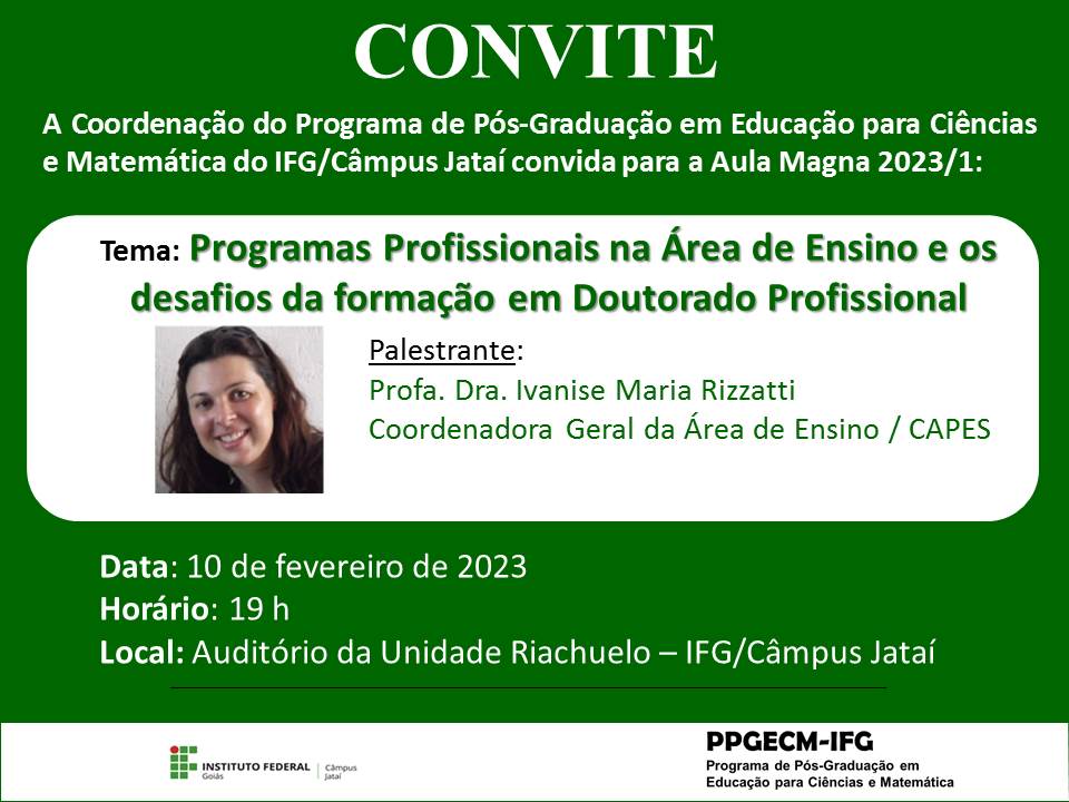 O Programa de Pós-Graduação em Educação para Ciências e Matemática (PPGECM) do Câmpus Jataí do Instituto Federal de Goiás (IFG) realiza na próxima sexta-feira, 10 de fevereiro, a...