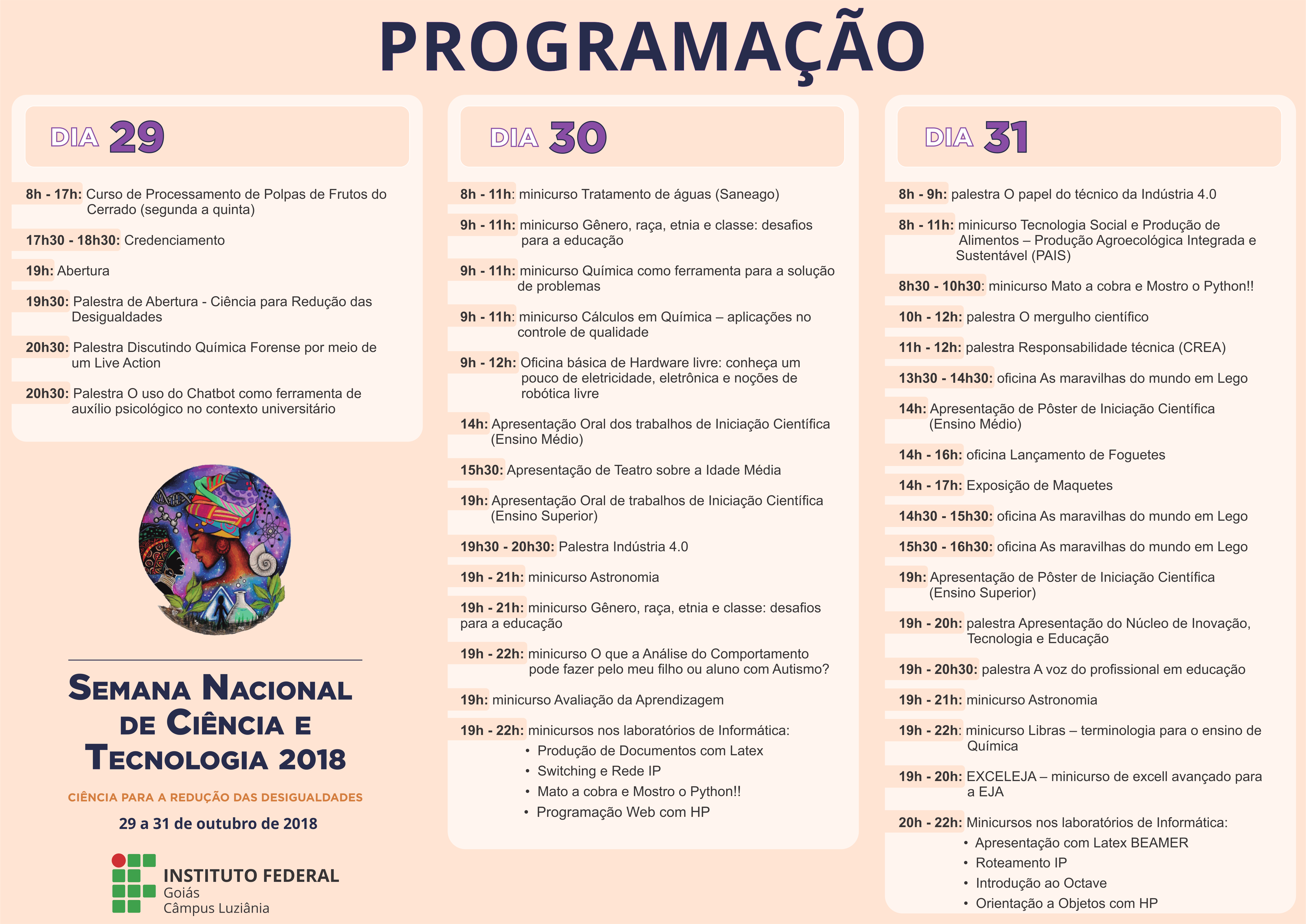 De 29 a 31 de outubro, o Câmpus Luziânia do Instituto Federal de Goiás realiza diversas atividades para toda a comunidade luzianiense durante a Semana Nacional de Ciência e Tecnologia (Secitec). Sua programação conta com palestras, minicursos, oficinas, atividades culturais e apresentações de trabalhos de pesquisa. As inscrições são gratuitas e podem ser feitas pelo site https://sugep.ifg.edu.br/eventos/#/publico/eventos/4f37e285-0cee-42ef-816a-6079c89540ee/inscricao.